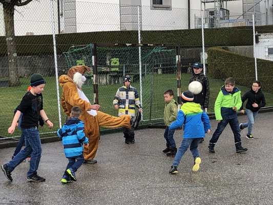 Welch eine Überraschung! Der Osterhase besuchte am Freitag, 8. April in der Pause die Kinder und Lehrpersonen der Schule Menzberg. Es freuten sich alle riesig, auch weil der Osterhase so gut Fussball spielen konnte. Einige Kinder wollten ihm vor dem Abschied noch ein Osterversli vortragen.