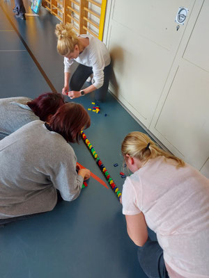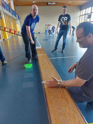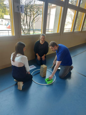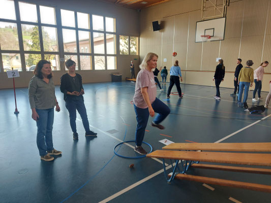 Eigentlich gingen das Schulpersonal davon aus, dass sie an der schulinternen Weiterbildung etwas zum Thema «Wirkungsvoll Sprechen» mit einer bewegten Pause machen würden. Es kam jedoch ganz anders. Aufgrund fehlender Kursleitung wurde die bewegte Pause vorgezogen. Die Lehrerinnen und Lehrer besammelten sich im Foyer der Rickenhalle und wurden sogleich in Teams eingeteilt. In den Gruppen galt es innerhalb von einer Stunde alle Posten zu bestreiten: Fröbelturm, Minigolf, Zielwerfen, Discgolf, Baumklotzstossen, Tannzapfenschiessen, Kegeln, Dart, Domino, Korbball, Reifenwurf, Murmelspicken, Leitergolf, Nageln. Die Stimmung war freudig und locker. Die erreichten Punkte wurden danach durch die Anzahl Gruppenteilnehmer verteilt.