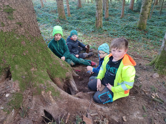 abschleppen, sich neben dem Bächlein aufhalten, eine Behausung bauen, die Osternester geniessen, im Wald toben und am Mittag ihr Essen auf dem Feuer zubereiten.