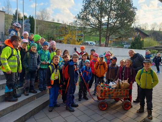 Mitsamt einem gut gefüllten Leiterwagen verbrachte die Basisstufe Geiss den Tag im Wald. Die Kinder konnten Baumstämme