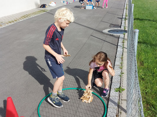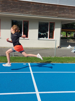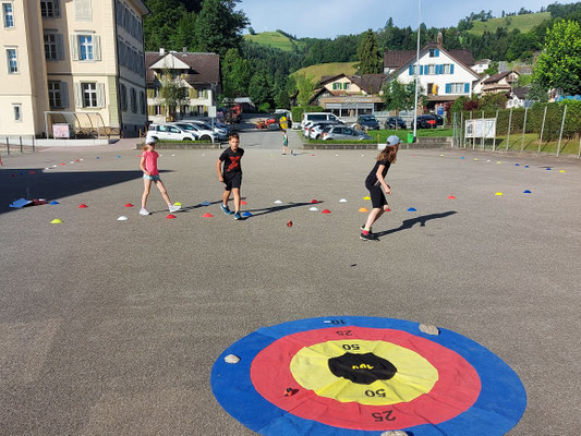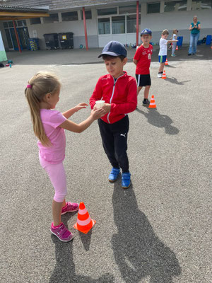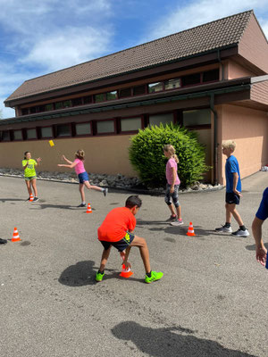 In einem internen Klassenduell traten die Schülerinnen und Schüler in zwei Gruppen an verschiedenen Posten gegeneinander an. Ein in Wasser getränkter Schwamm flog durch die Lüfte, Kapplatürme wackelten im Wind, Seile drehten sich, Plachen wurden kleiner, Zusatzschlaufen beim Biathlon freuten sich über die Läufer und Läuferinnen, der Hindernisparcours liess die Kinder streng atmen und die Fliegenklatsche schlug den Luftballon. Beim Schnelllauf und Bälleliwerfen versuchten alle ihr Bestes zu geben.