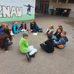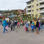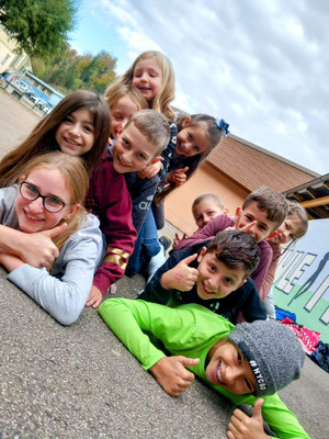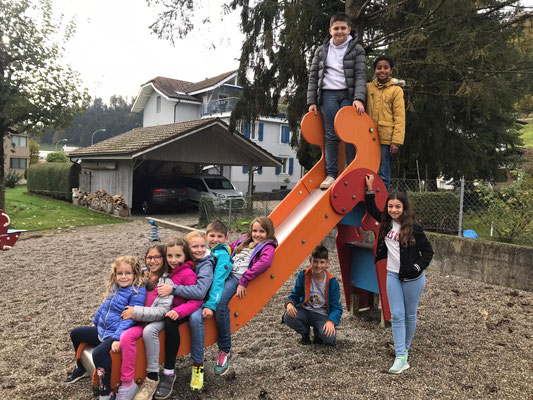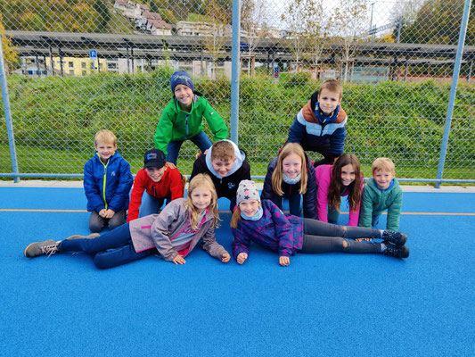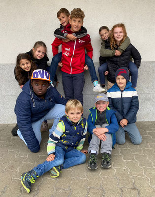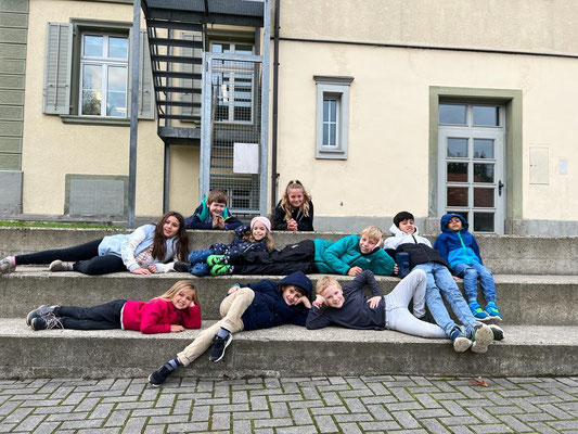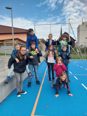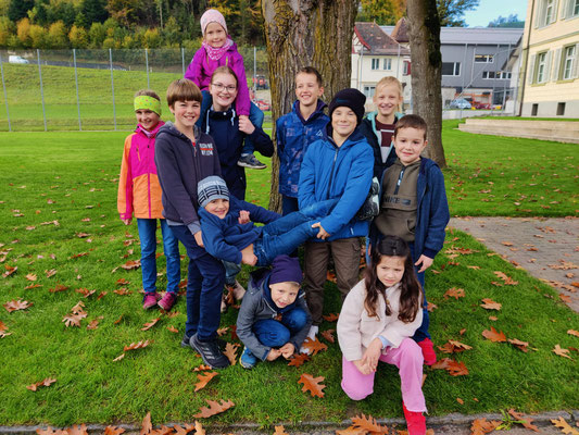 Am 28.10.2022 fand nach der grossen Pause am Morgen der Kennenlerntag statt. Der Treffpunkt war beim Maschendrahtzaun. Die am Zaun befestigten Ziffern von 1 bis 16 halfen den Kindern sich in den Familien zu treffen. Die Lehrpersonen holten ihre zugeteilte Schulfamilie ab, um mit ihnen die gemeinsamen Regeln durchzugehen. Um alle Namen in der Schulfamilie zu kennen, gab es zu Beginn ein Kennenlernspiel, bei dem die Kinder sich einen Tennisball zuwarfen. Danach galt es in der Gruppe den gordischen Knoten zu lösen. Die Kinder fassten mit ihren Händen überkreuzt je zwei andere Hände der Gruppe. Nun galt es den Knoten, ohne sich loszulassen, zu lösen. Die Schulfamilie inszenierte bevor es zum Ausgangspunkt zurückging ein Familienfoto fürs Album.