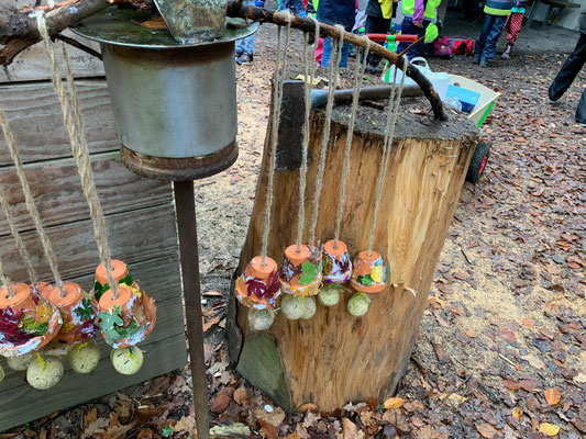 Bei unserer Lieblingsstelle im Wald bekamen die Kinder ein Tontöpfchen, einen Meisenknödel und eine Schnur. Anschliessend folgte eine genaue Anleitung zur Erstellung der Vogelfutterglocke.