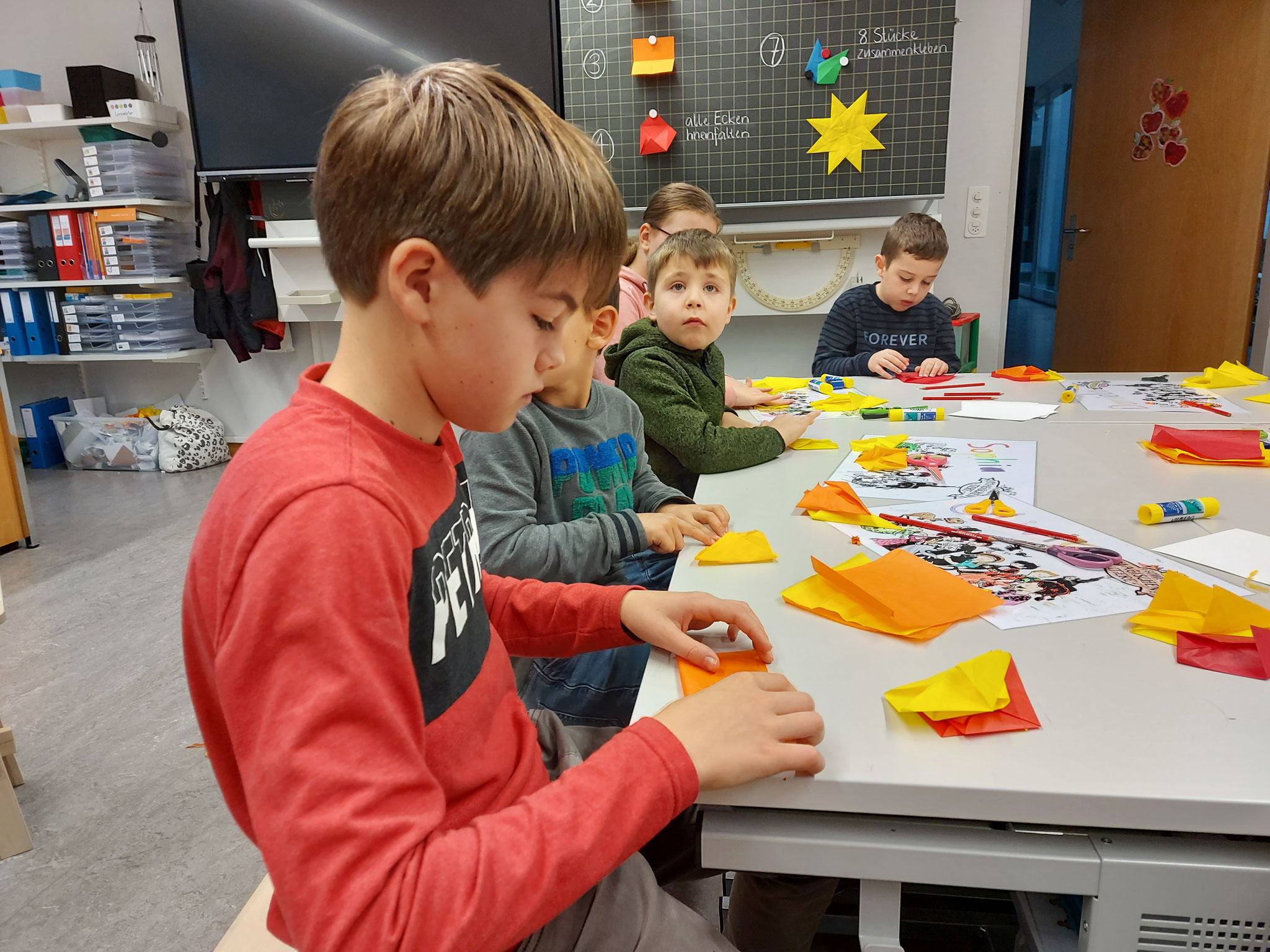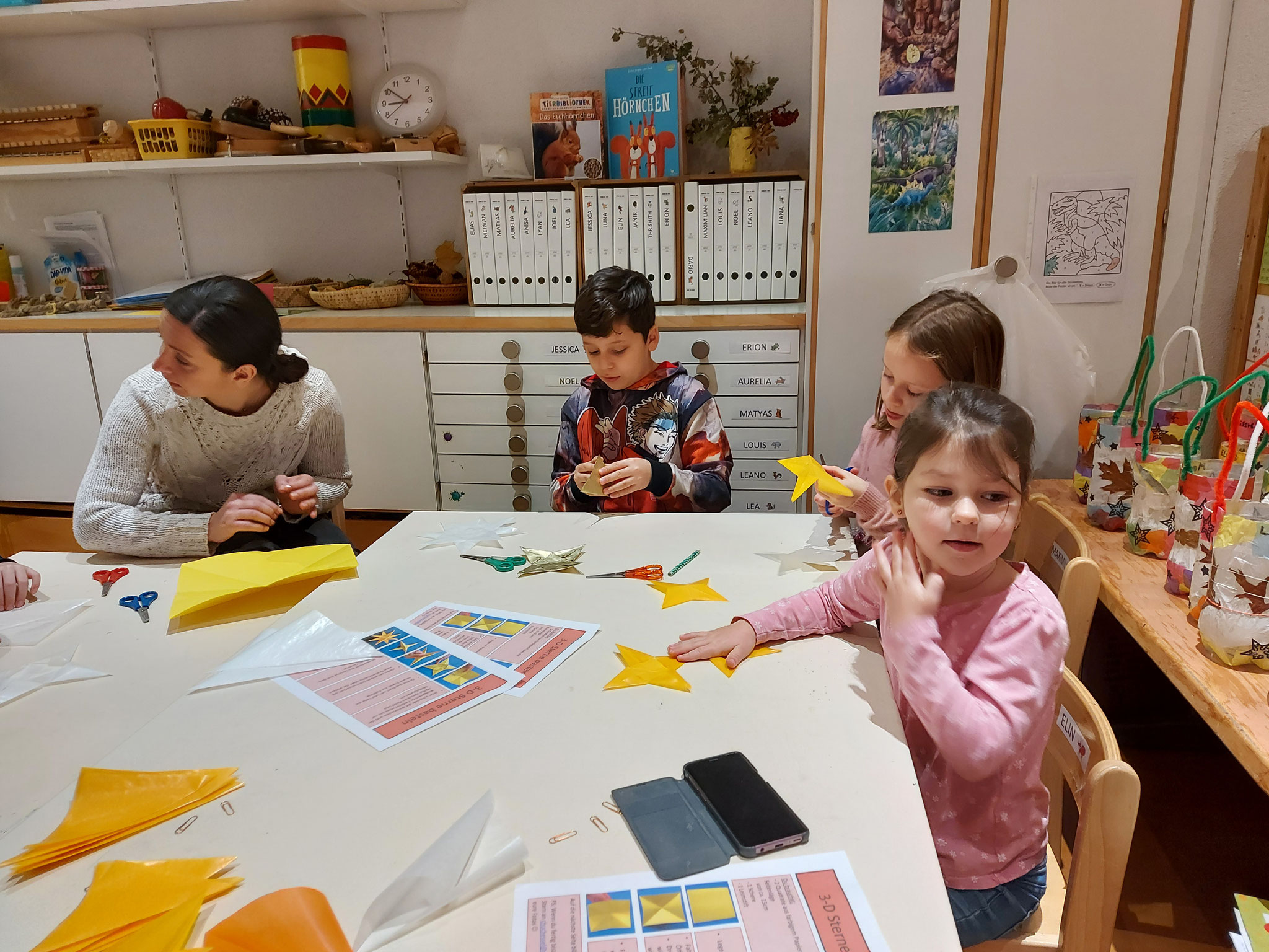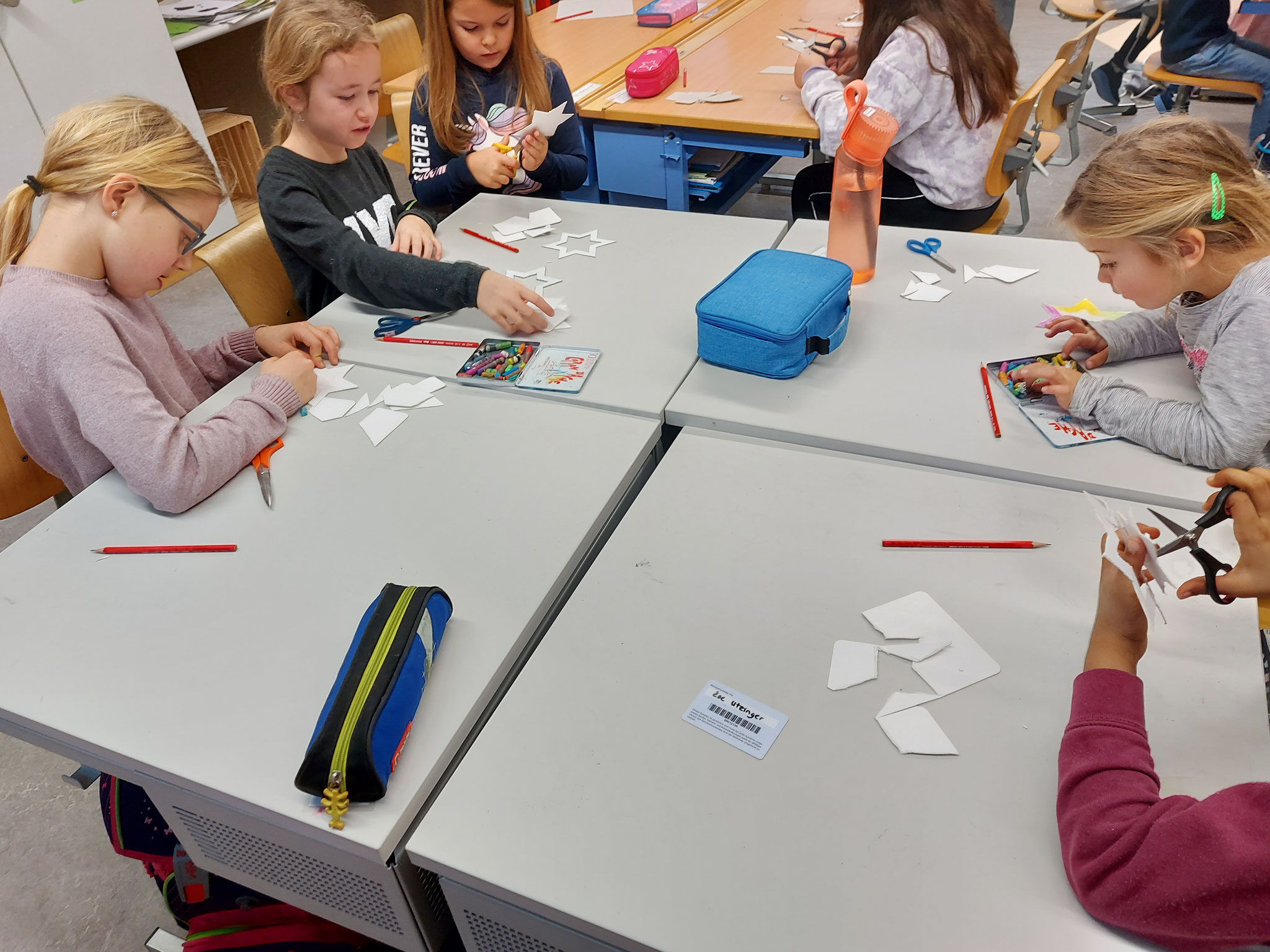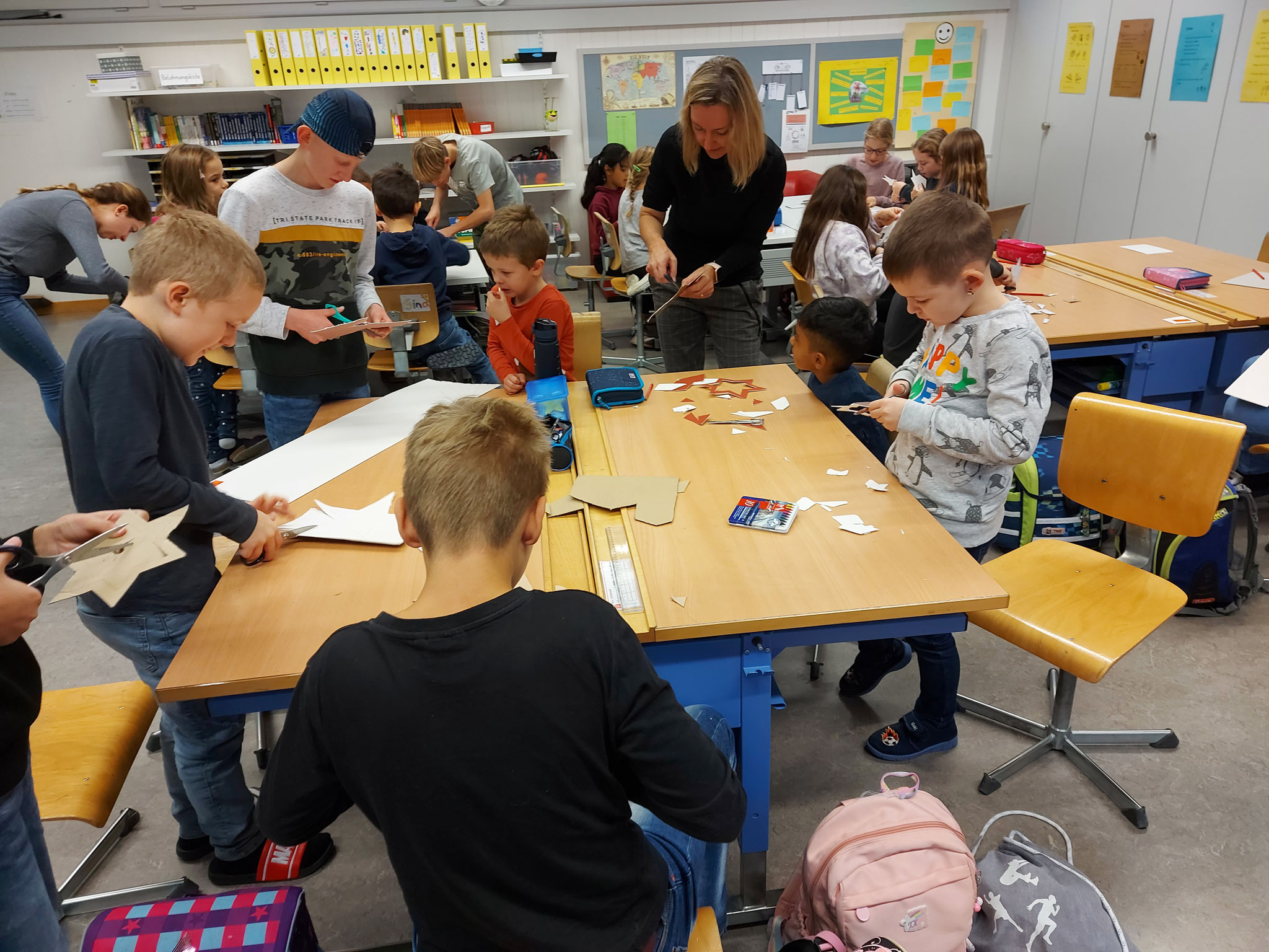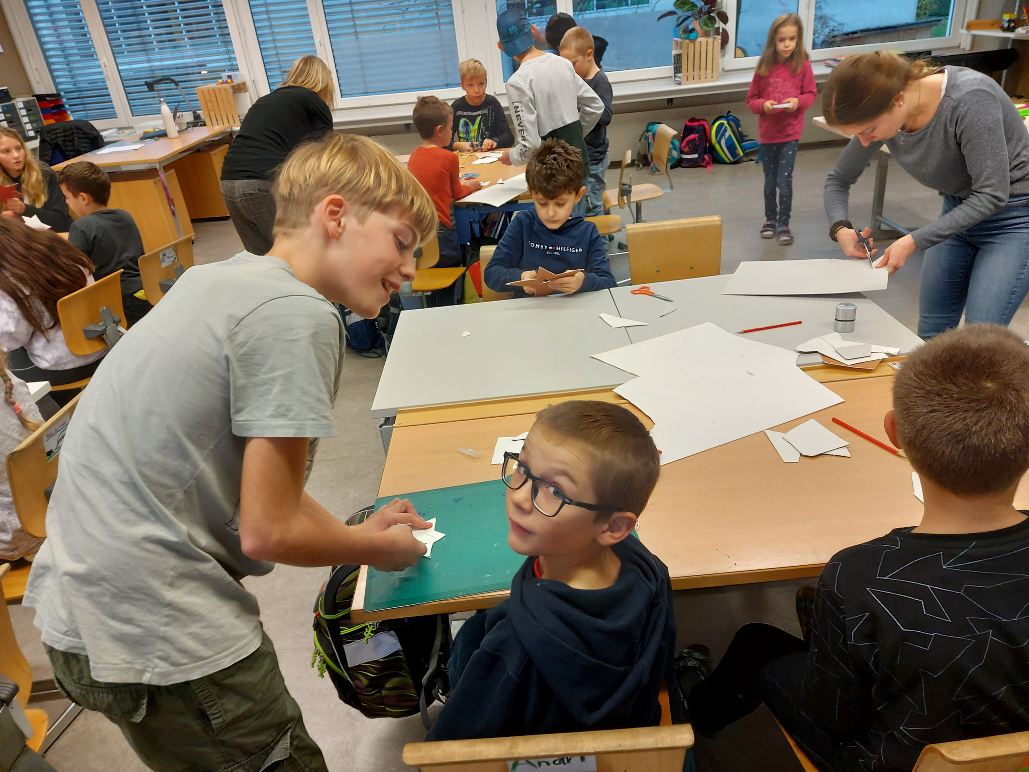 Am Mittwochmorgen 30.11.2022 trafen sich die Schulfamilien in der Turnhalle. Die Schülerinnen und Schüler der 6. Klasse besammelten ihre Schulfamilie. Miteinander sangen sie das Samichlauslied. Die zugeteilten Lehrpersonen führten die Kinder in ihre Klassenräume und erklärten den Schulfamilien die Sternenbastelei. Bei der Arbeit unterstützten die älteren Schüler die Jüngeren. Pünktlich vor dem ersten Dezember ist das Schulhaus mit vielen verschiedenen und schön gestalteten Sternen dekoriert.