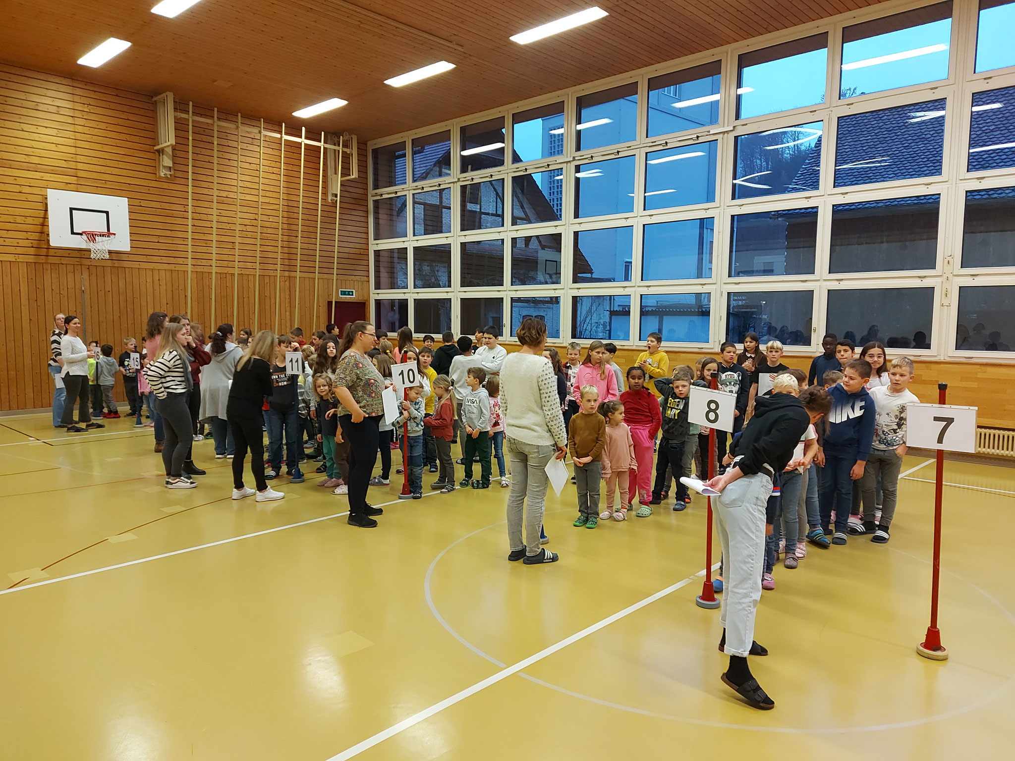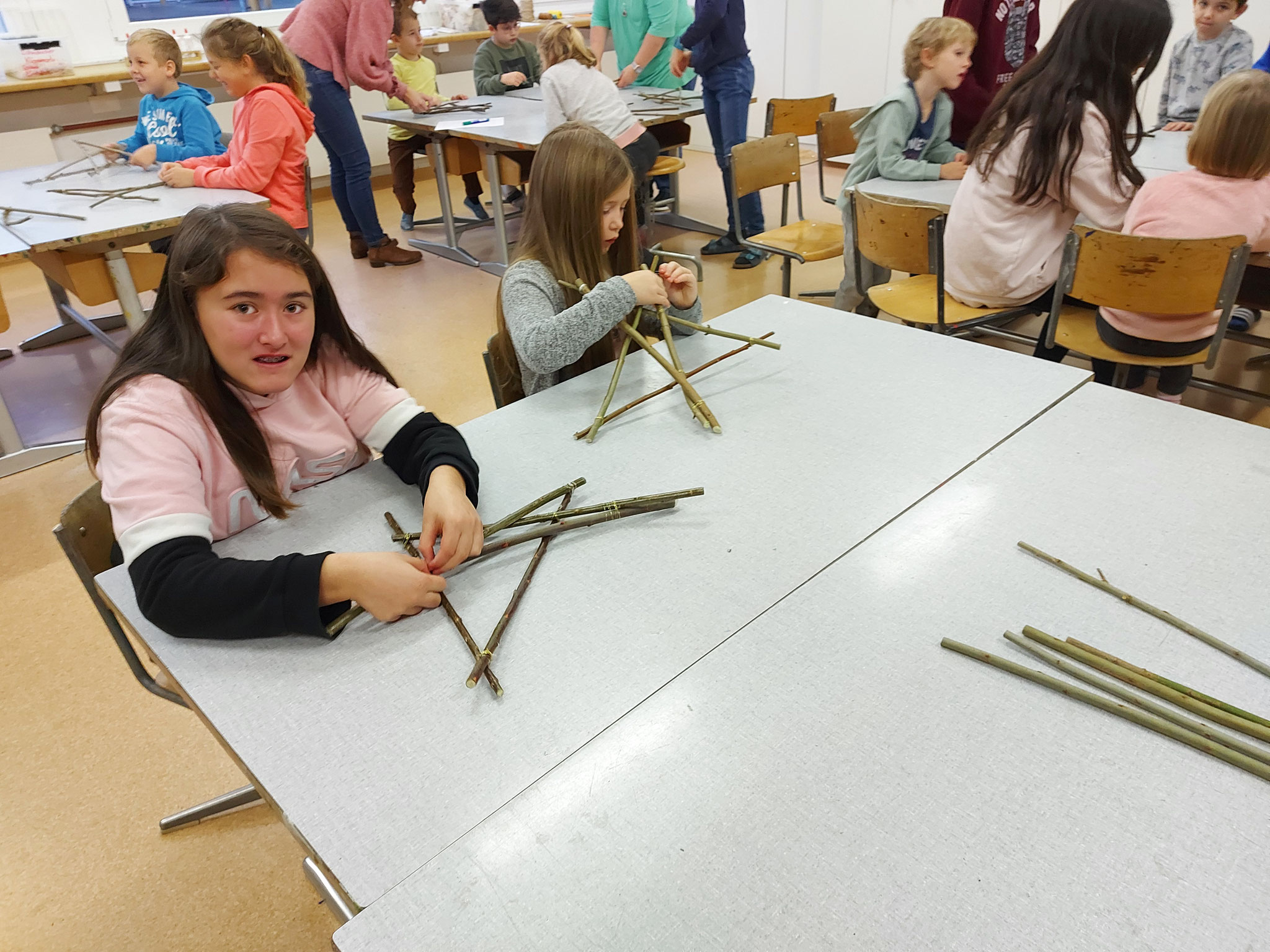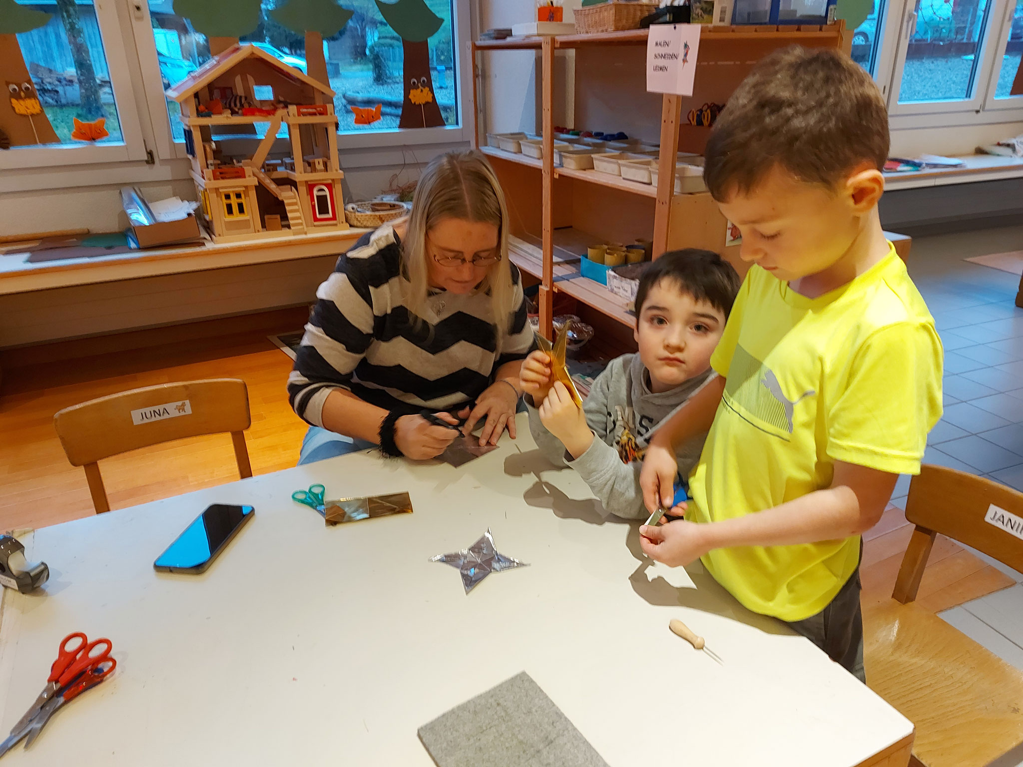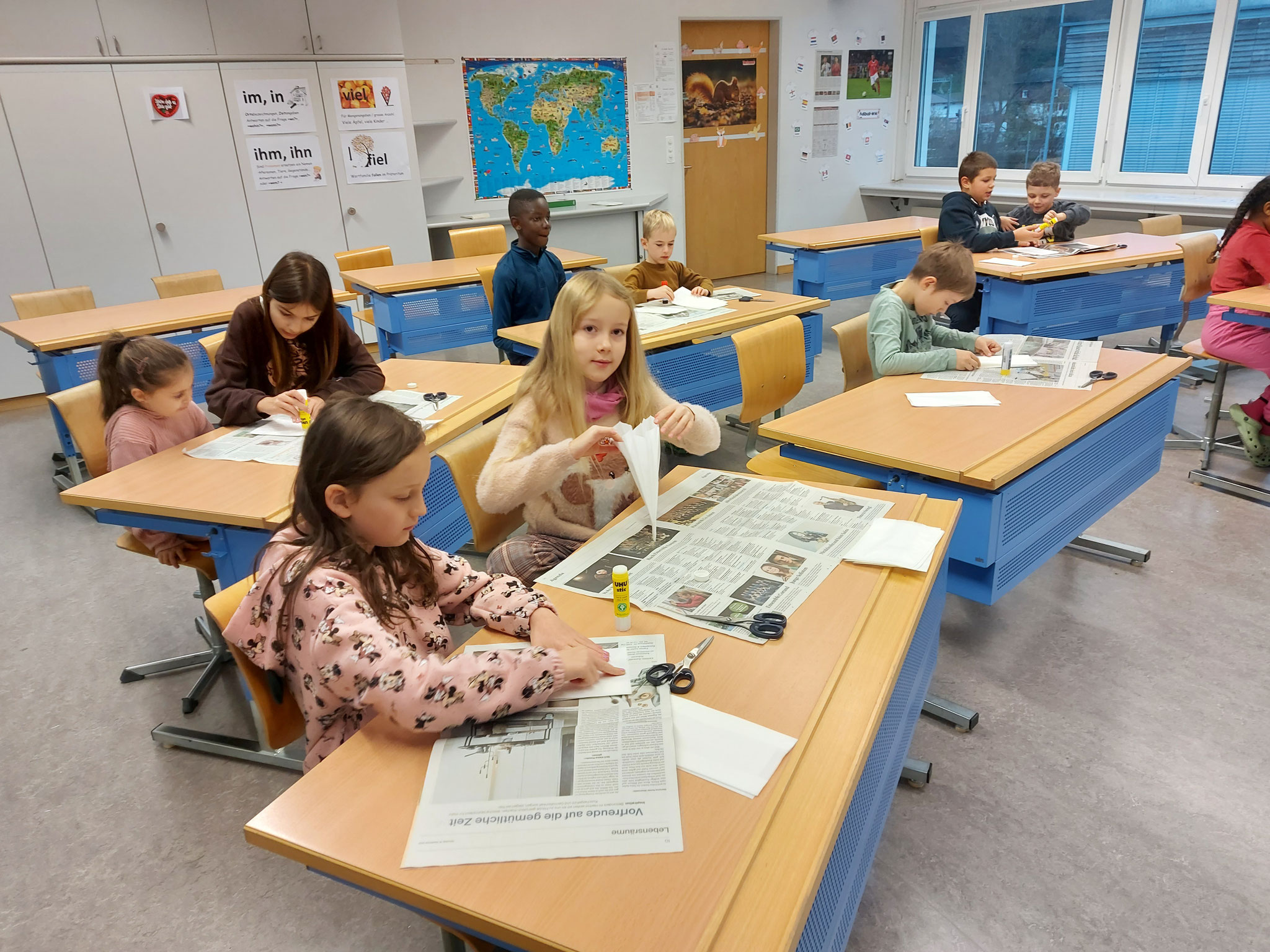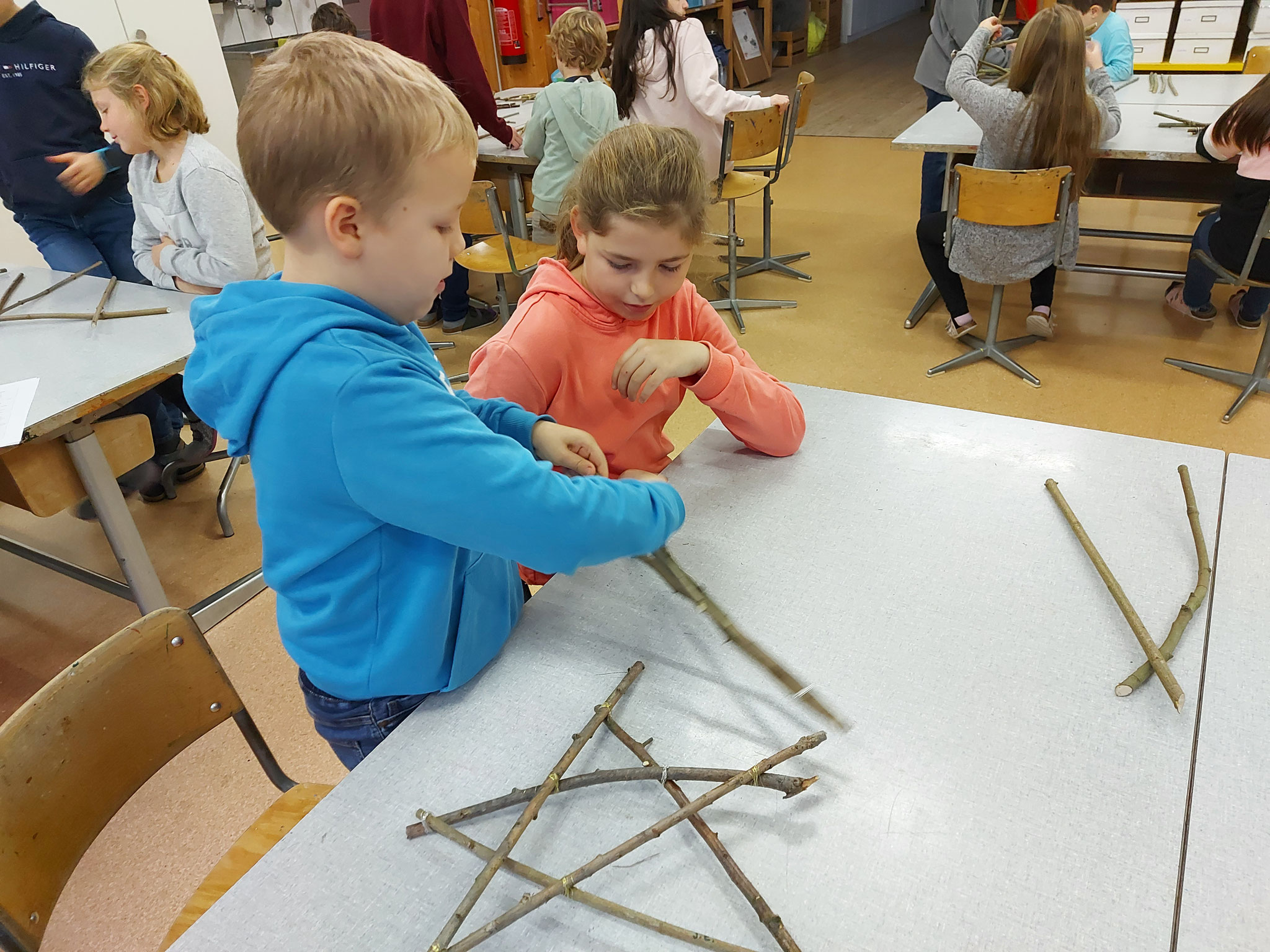 Am Mittwochmorgen 30.11.2022 trafen sich die Schulfamilien in der Turnhalle. Die Schülerinnen und Schüler der 6. Klasse besammelten ihre Schulfamilie. Miteinander sangen sie das Samichlauslied. Die zugeteilten Lehrpersonen führten die Kinder in ihre Klassenräume und erklärten den Schulfamilien die Sternenbastelei. Bei der Arbeit unterstützten die älteren Schüler die Jüngeren. Pünktlich vor dem ersten Dezember ist das Schulhaus mit vielen verschiedenen und schön gestalteten Sternen dekoriert.