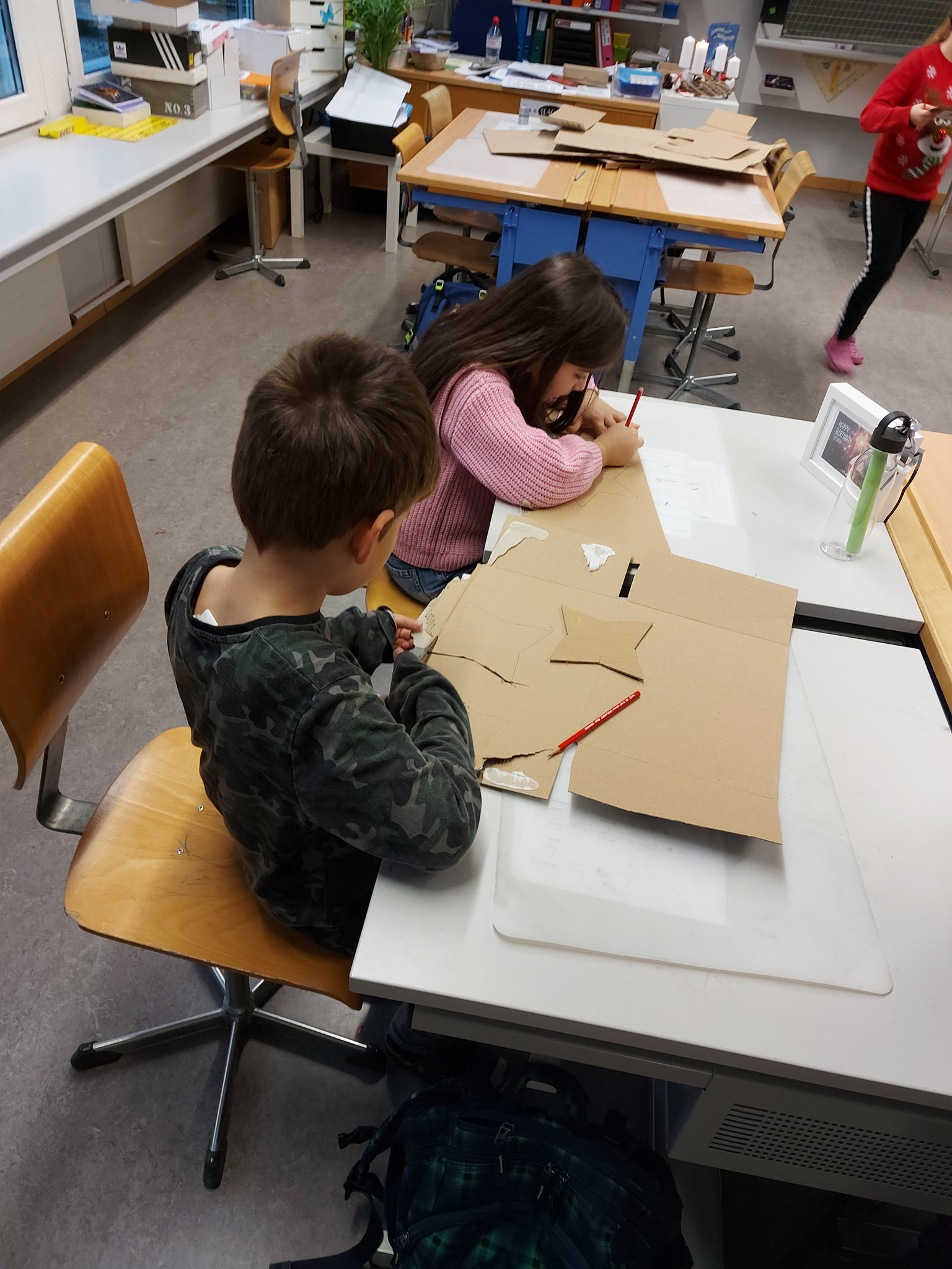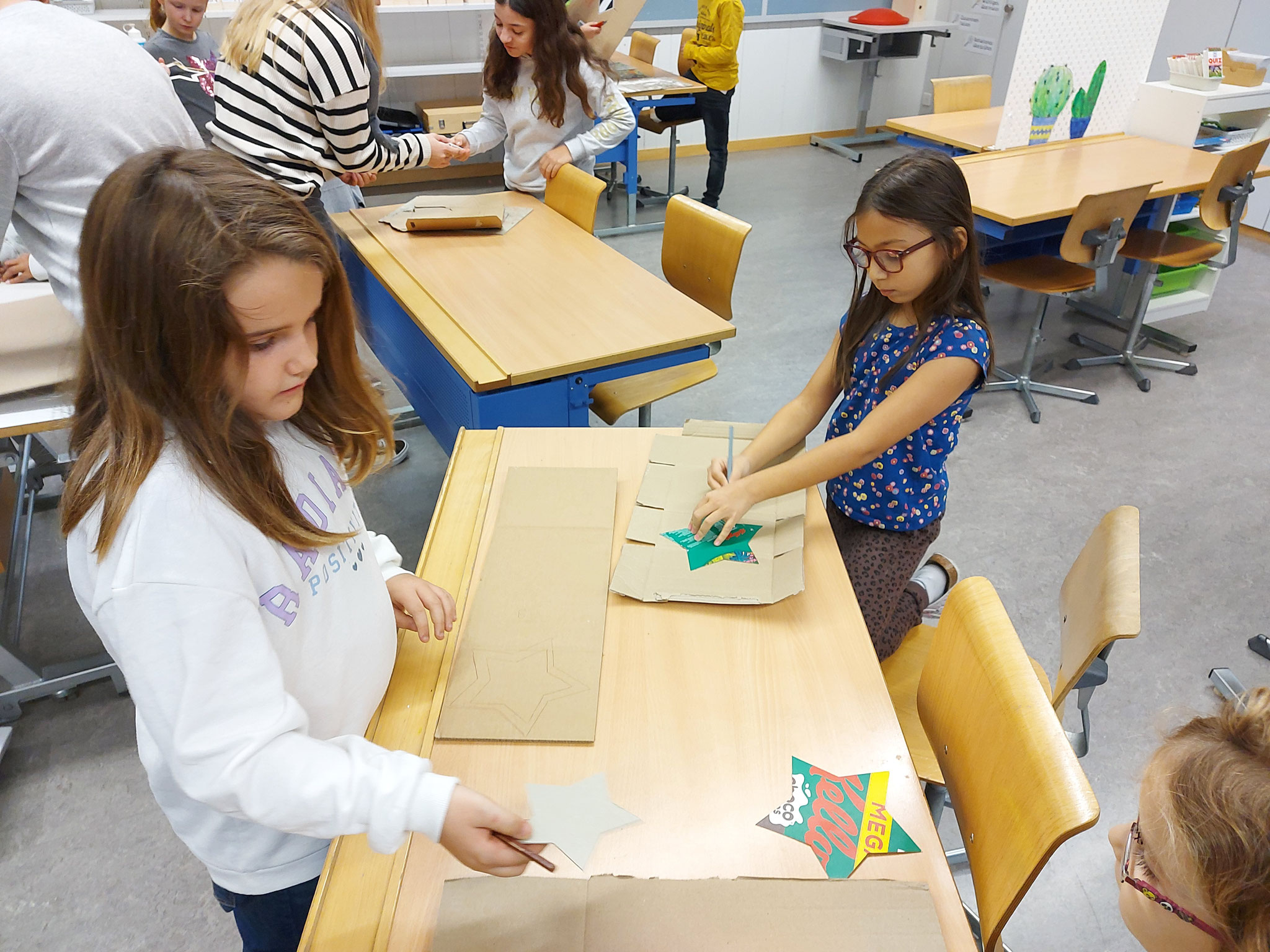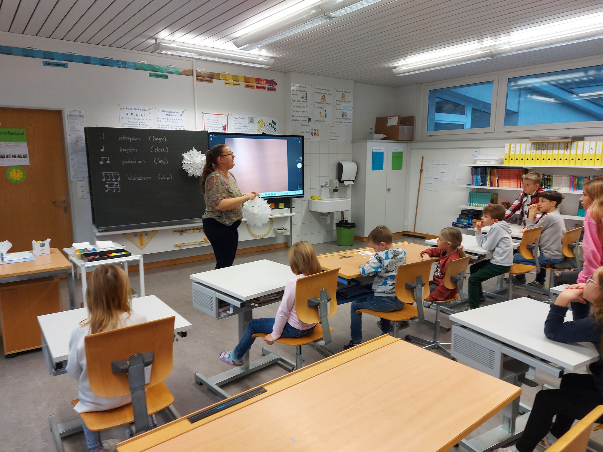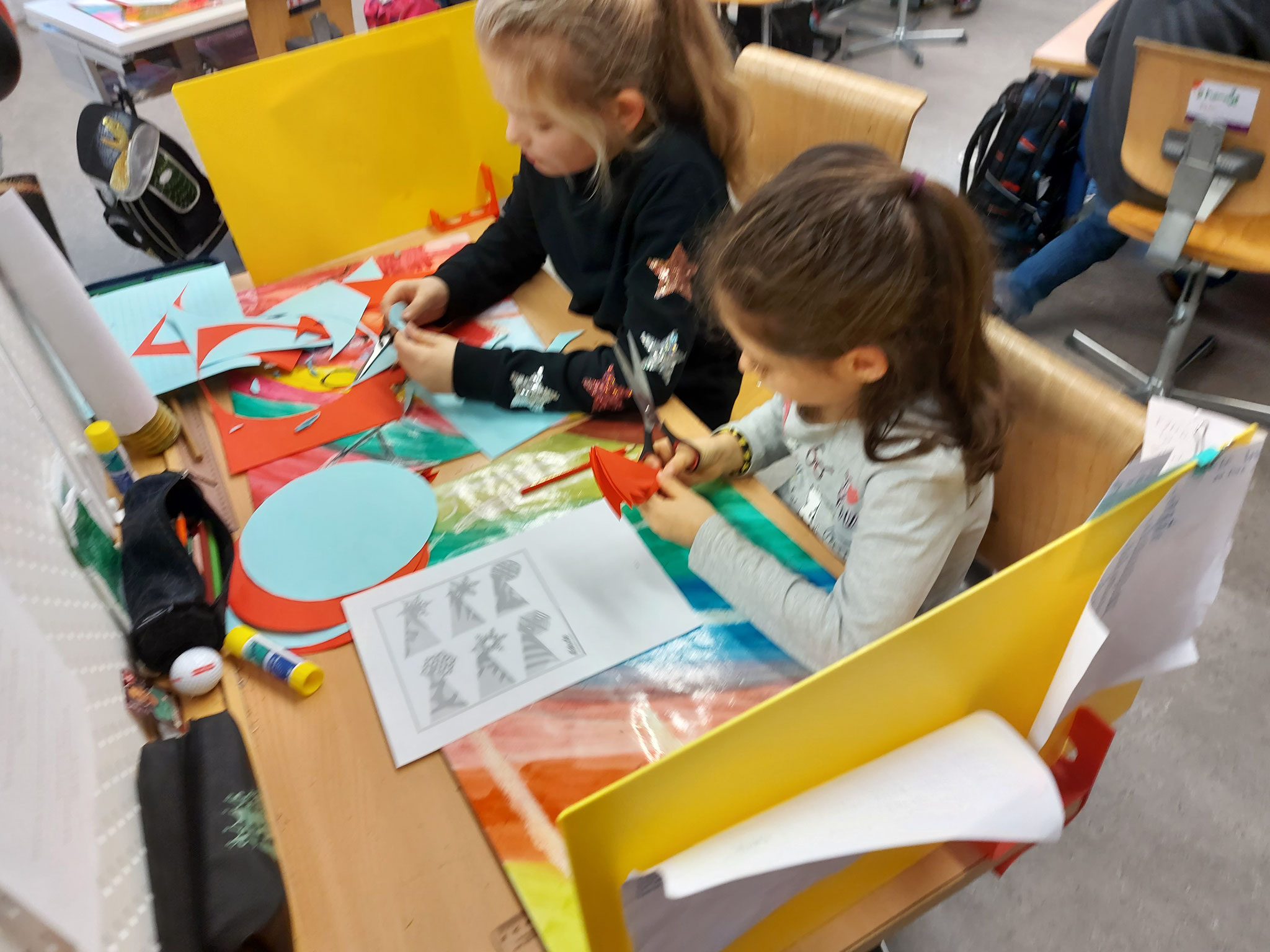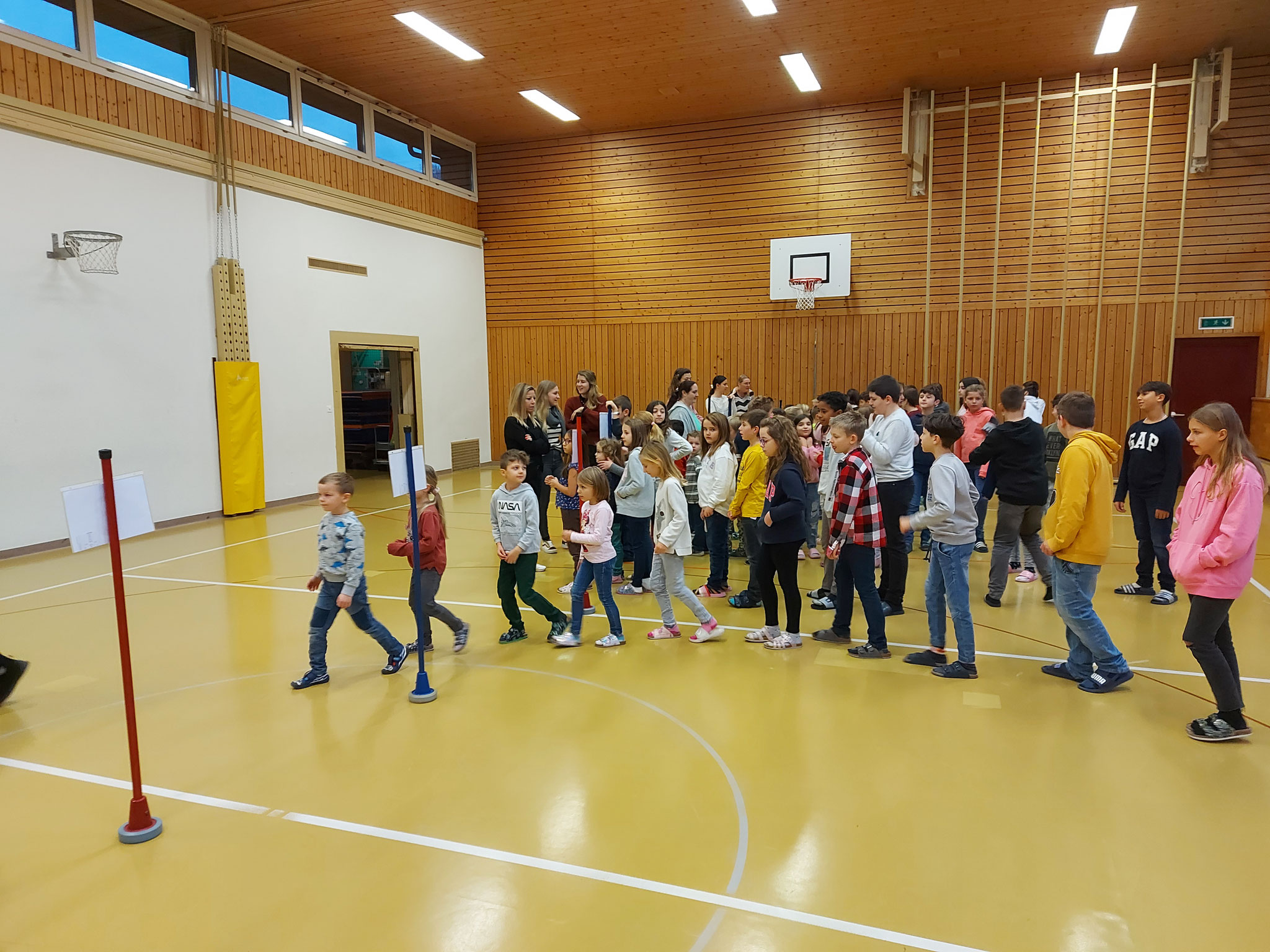 Am Mittwochmorgen 30.11.2022 trafen sich die Schulfamilien in der Turnhalle. Die Schülerinnen und Schüler der 6. Klasse besammelten ihre Schulfamilie. Miteinander sangen sie das Samichlauslied. Die zugeteilten Lehrpersonen führten die Kinder in ihre Klassenräume und erklärten den Schulfamilien die Sternenbastelei. Bei der Arbeit unterstützten die älteren Schüler die Jüngeren. Pünktlich vor dem ersten Dezember ist das Schulhaus mit vielen verschiedenen und schön gestalteten Sternen dekoriert.