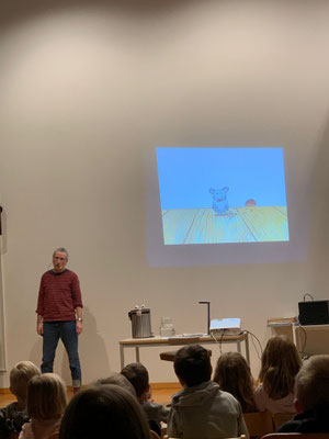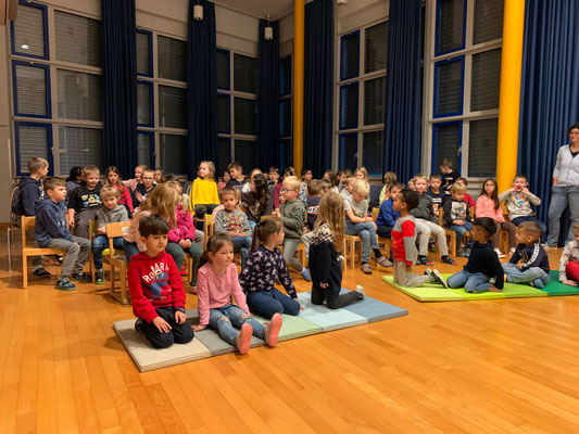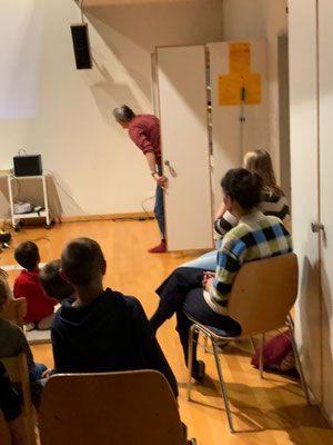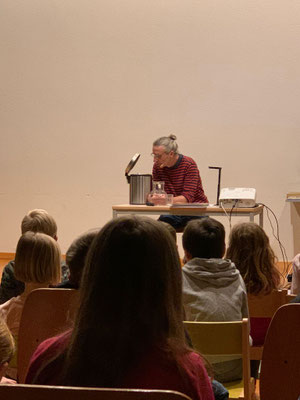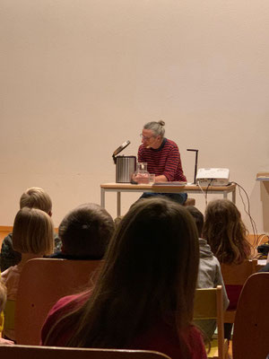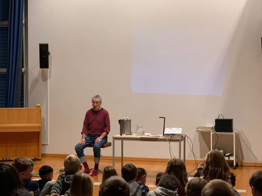 Gespannt warteten die Kinder der Kindergärten und 1./2. Klassen im Singsaal auf Lorenz Pauli. Da hörten wir von irgendwoher Gähnen, Seufzen und Gemurmel, er war aber noch gar nicht aufgetaucht… Was für eine Überraschung, als sich plötzlich langsam die Schranktüre öffnete und er mit seinen rot-schwarz gestreiften Socken und dem passenden Shirt daraus hervorkroch. Von der ersten Sekunde an war der Schabernak-Funke auf sein Publikum übergesprungen. Zusammen erfanden wir zum Einstieg eine Geschichte. Danach erzählte er noch viele weitere, jede einzelne lustig, spannend, packend. Zu Besuch war auch ein sprechender Abfalleimer, der vorlaut immerzu «Nein» sagte und sich in die Geschichten einmischte. Begeistert applaudierte das Publikum an Schluss, es war ein sehr anregender, gelungener Anlass!