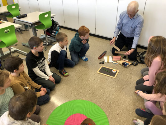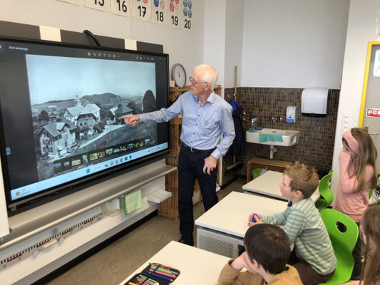 Mitte März besuchte Josef Vogel die Basisstufe Menzberg, die sich zu dem Zeitpunkt mit dem Thema Schule früher und heute befasste. Er erzählte anschaulich und spannend wie es war, als er noch in Menzberg zur Schule ging. Das Schulmaterial, das er mitbrachte, löste Erstaunen und Bewunderung aus. Welch schöne Schrift in den alten Schulheften von Sepp Vogel zu sehen ist! Er zeigte den Kindern neben dem Griffel auch die Schreibfeder und erklärte ihnen, dass man diese zuerst in den Mund nehmen musste, damit das Fett darauf entfernt wurde. Ansonsten wäre da keine Tinte beim Eintauchen in das Tintenfässli haften geblieben. Zu den Bildern an der digitalen Wandtafel hatte er viele interessante und erstaunliche Geschichten zu erzählen. Während zwei Lektionen lauschten die 1./2. Klässler wie gebannt. Diese kannten bereits einige Strafmethoden, die man früher angewandt hatte aus dem Unterricht, aber dass man auf dem Menzberg bei schlechtem Benehmen einen Nuggi in den Mund nehmen musste, fanden die Kinder sehr ungerecht und »gruusig».