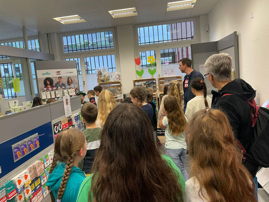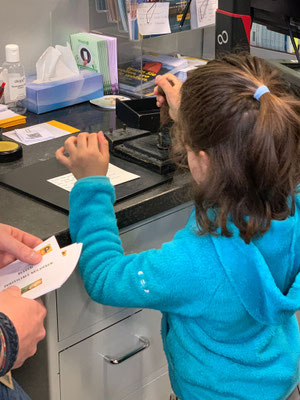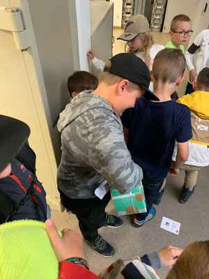 Bei der Führung gab es Vieles zu entdecken. Mario zeigte uns auch wie man ein Päckli aufgeben kann, ohne an den Schalter zu gehen. Auf einer Tausendernote machte er uns auf die Sicherheitszeichen aufmerksam und alle Kinder konnten 1000 Fünfliber in den Händen halten. Das war aber ein schwerer Schatz! Besonders Eindruck machten den Kindern die Menznauer-Postfächli, wo sie ihren Familiennamen lesen konnten.