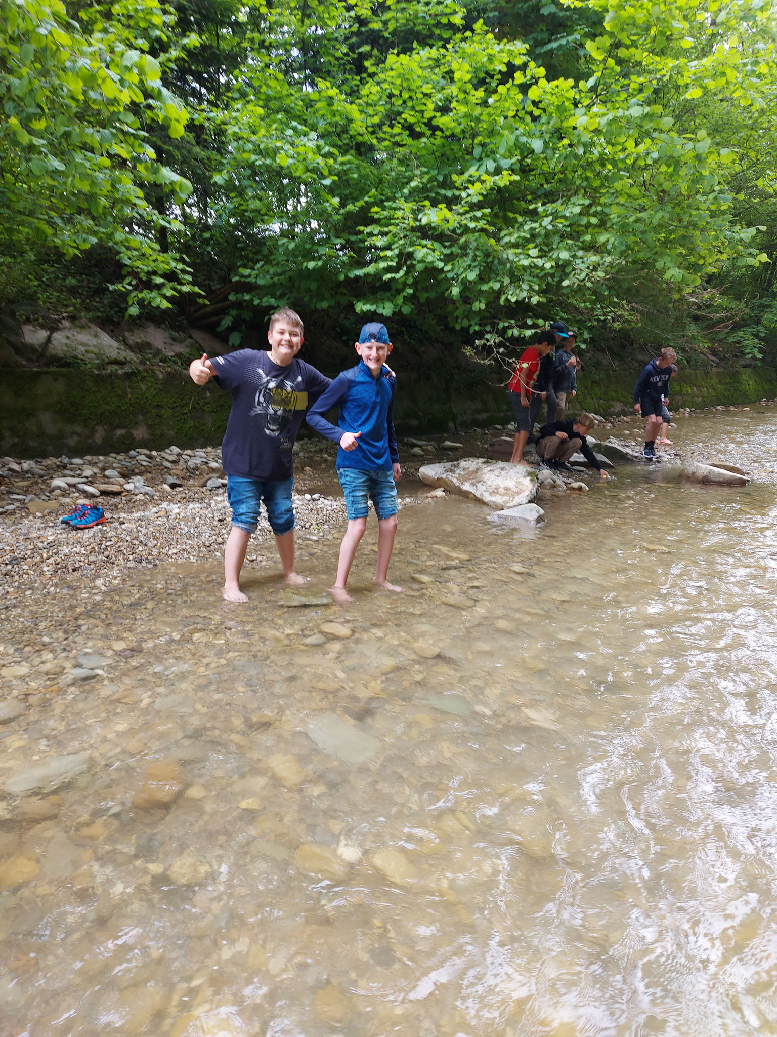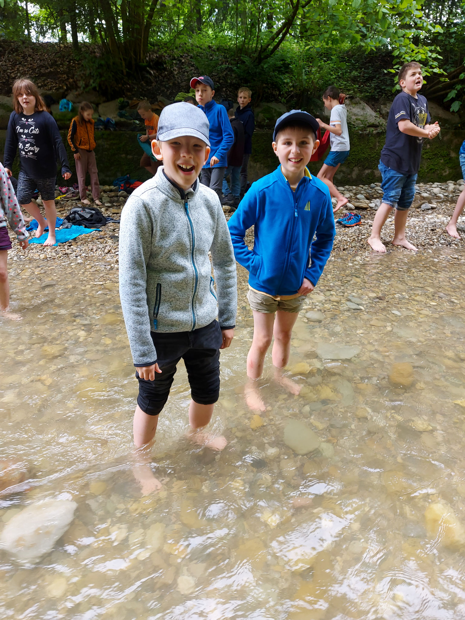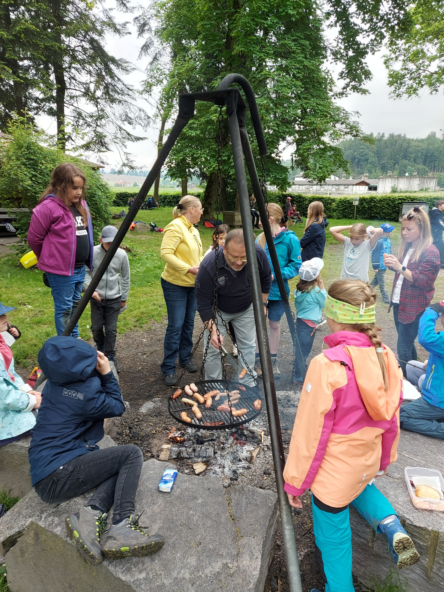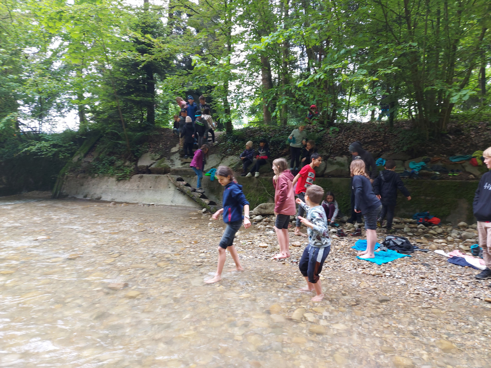 Am Mittag trafen alle Klassen auf dem Spielplatz an der Luther in Schötz ein. Es war bereits eingefeuert, damit die Kinder ihre Wurst grillieren konnten oder besser gesagt, grillieren liessen, damit sie sofort wieder auf die Bäume konnten. Mutige durften auch Barfuss in die Luther steigen - das Wasser war eisig und bei einigen Kindern waren letztlich nicht nur die Füsse nass. Zum Glück hatten die meisten ein Badetuch und eine Jacke dabei.