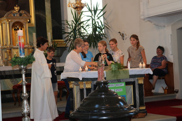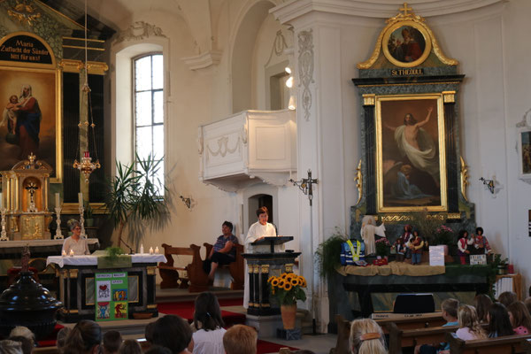 Auch die Pfingstgeschichte aus der Bibel, vorgetragen von der Pfarreiseelsorgerin sprach von Mut und die Fürbitten drückten die Wünsche der Schulkinder fürs neue Schuljahr aus. Mit den beliebten Liedern «Mit Gott chani rede» und «Überall isch Gott» rundeten die Kinder die Feier ab.