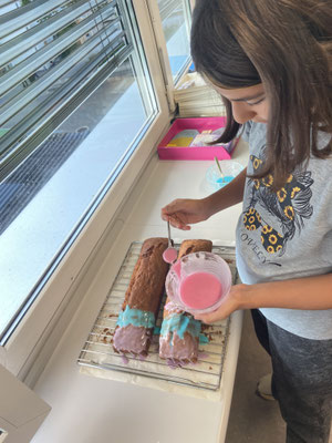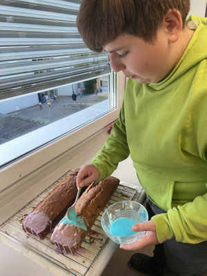 Gestern wir haben zwei Kuchen gebacken. Ein für 5. Klasse und ein für die 6. Klasse. Zuerst wir haben Teig gemacht. Dann wir haben die Schokolade in kleinen Stücke geschnitten. Wir haben die kleine Stücke von Schokolade im Teig gelegen. Dann diese Teig wir haben in die Formen geleert. Dann wir haben die Formen in Backofen gelegen. Am nächsten Tag wir haben die Glasur gemacht.