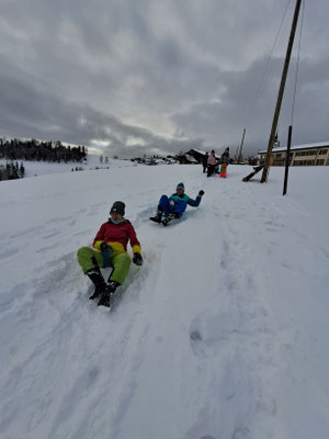 Die 3.-6. Klasse Menzberg geniesst beim Schlitteln den ersten Schnee im Winter 23/24. Die SuS sausen mit dem Födlebop die Piste hinunter. Andere flitzen auf dem eigenen Bop im Höllentempo hinab. Die besonders kreativen SuS machen Schlangen und Cofahrten, die meistens nicht zum Ziel führen aber doppelt so viel Spass bereiten.