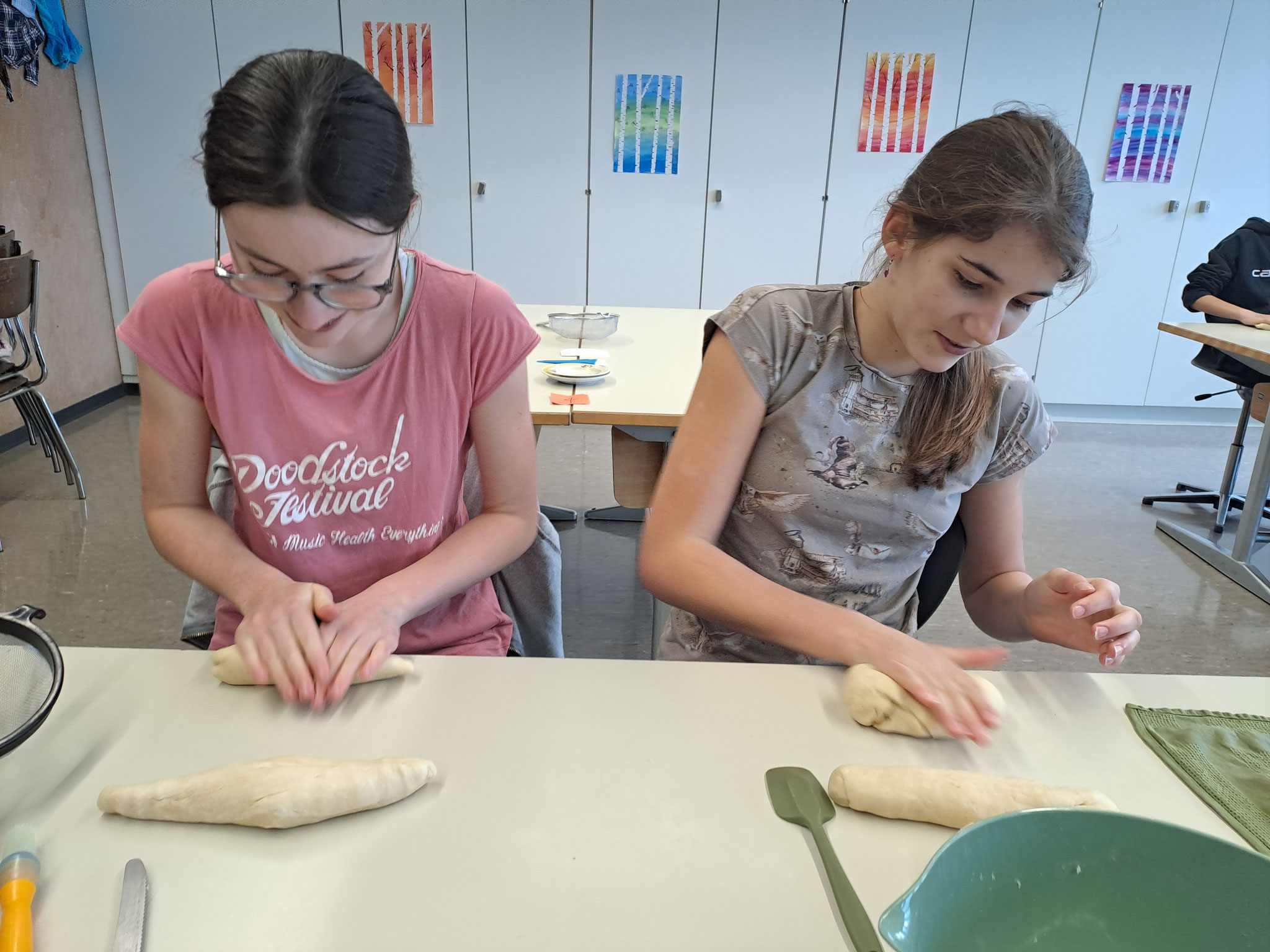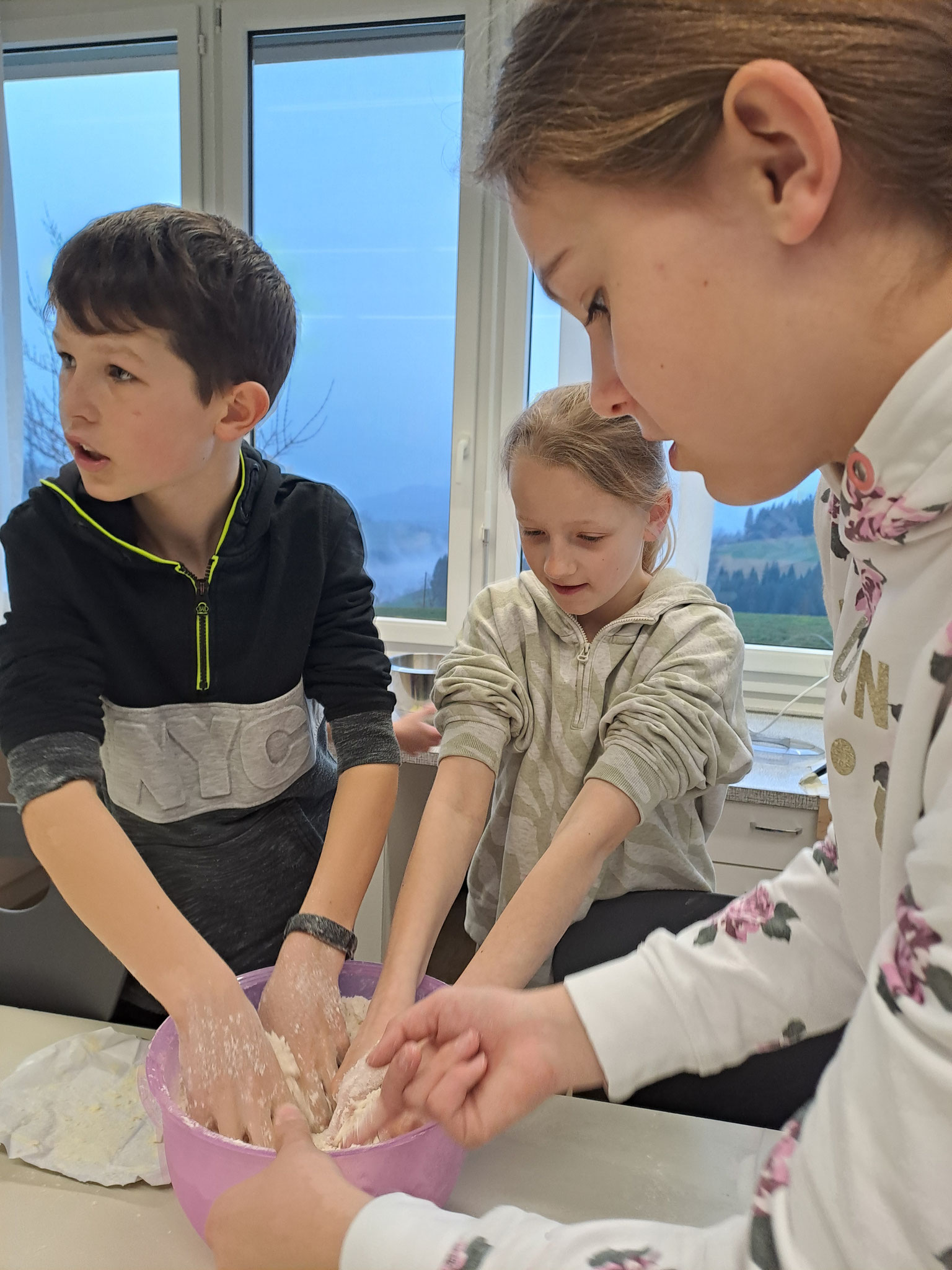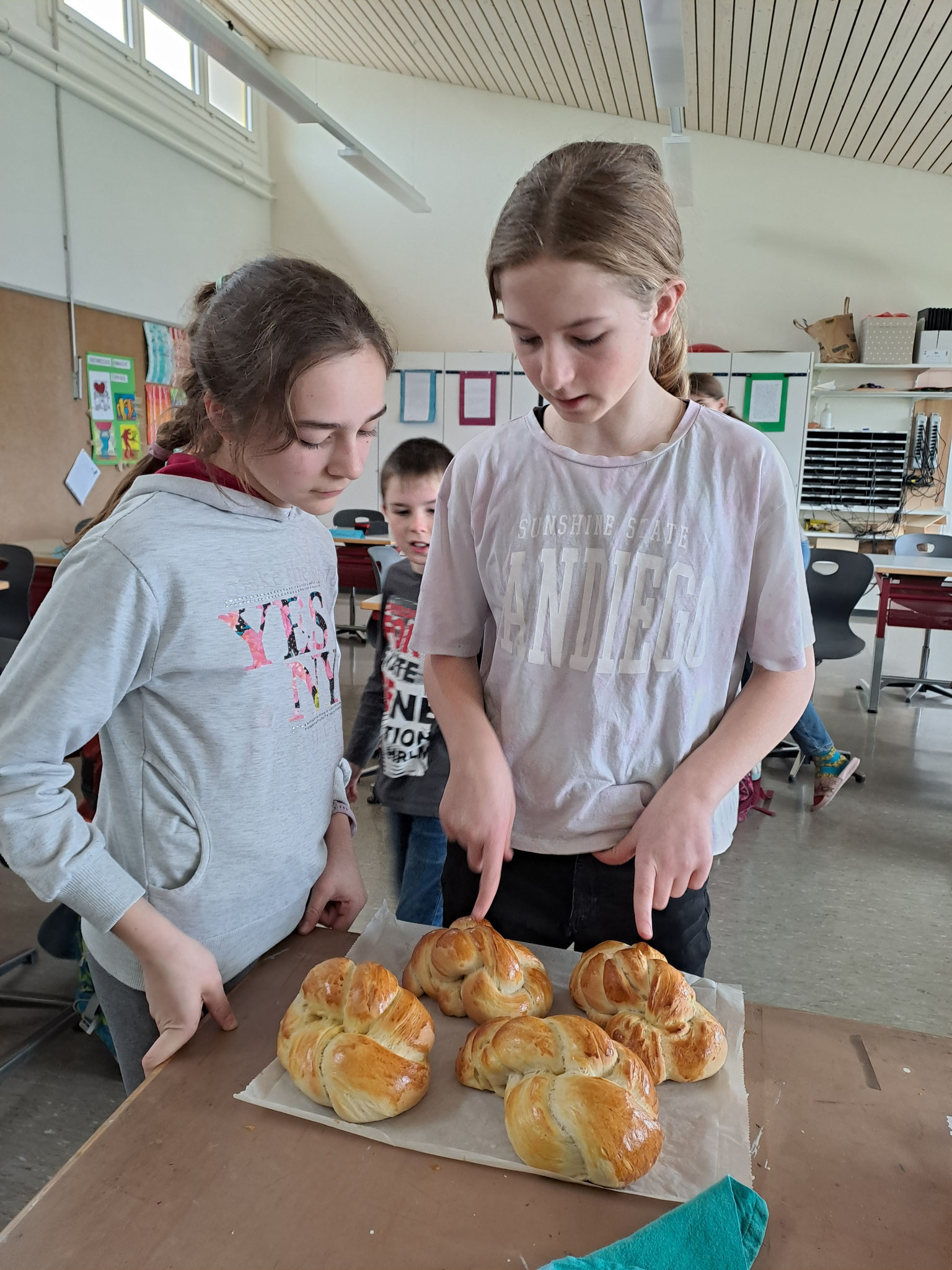 Die 3. - 6. Klasse Menzberg backt an drei Vormittagen Zöpfe, damit diese an Kunden verkauft werden. Die Zöpfe werden auf Bestellung hergestellt. Die Schülerinnen und Schüler arbeiten in Gruppen und liefern die Zöpfe später an die Kunden aus. Das Mehl für die Verarbeitung stammt von der Bäckerei Steiner und wird gespendet. Das ist grosszügig!
