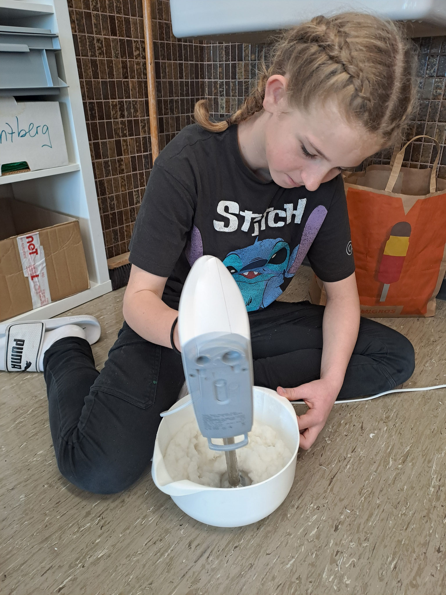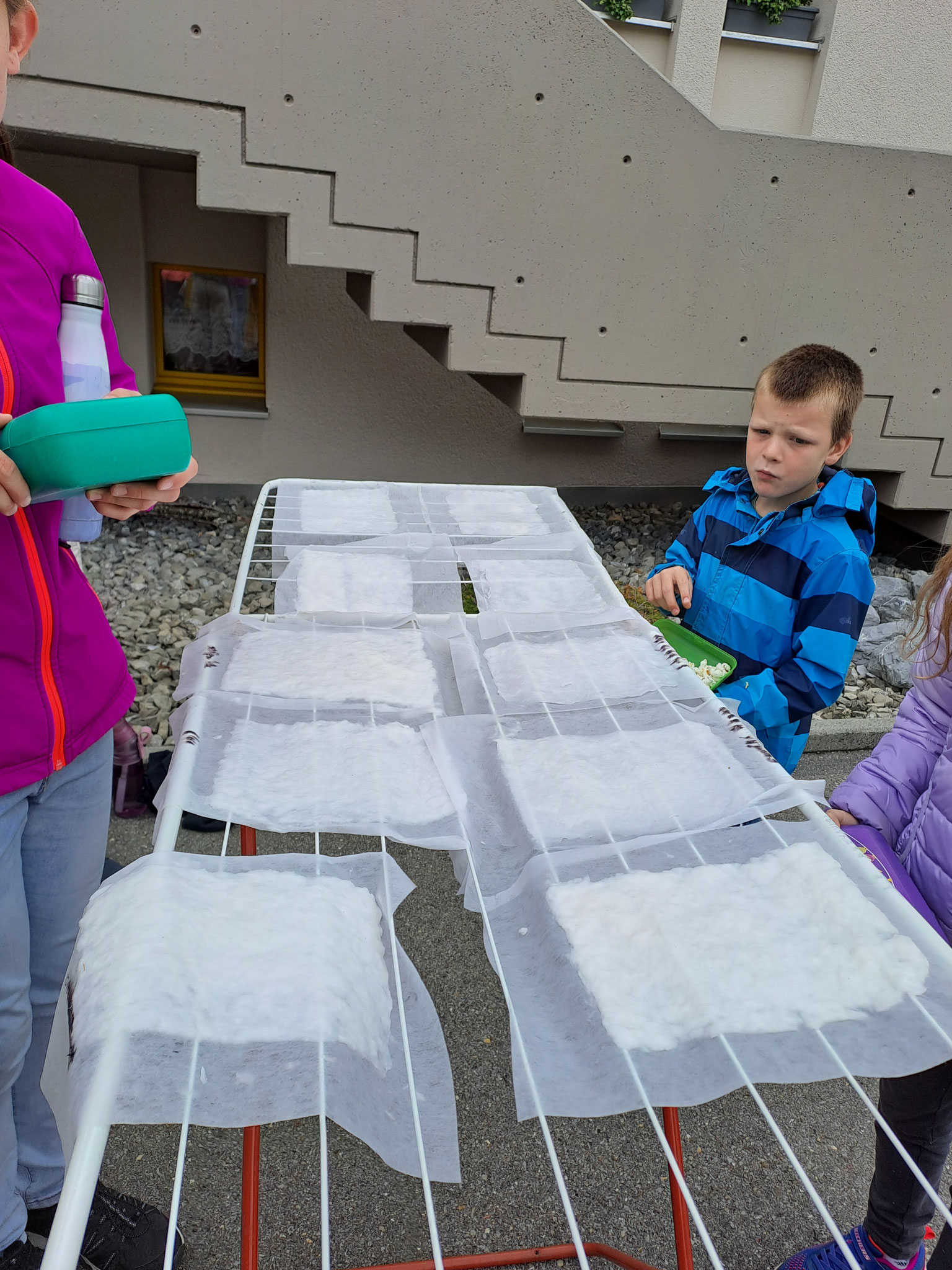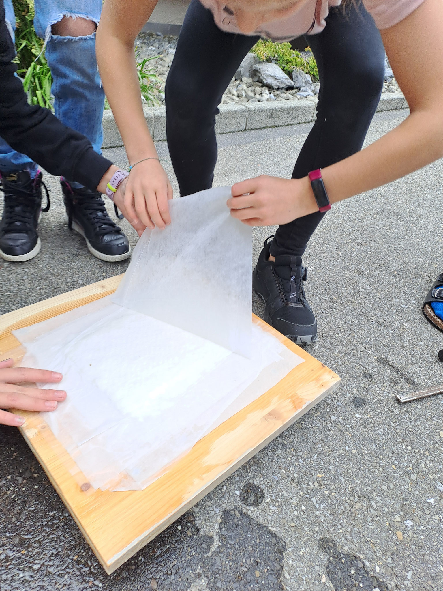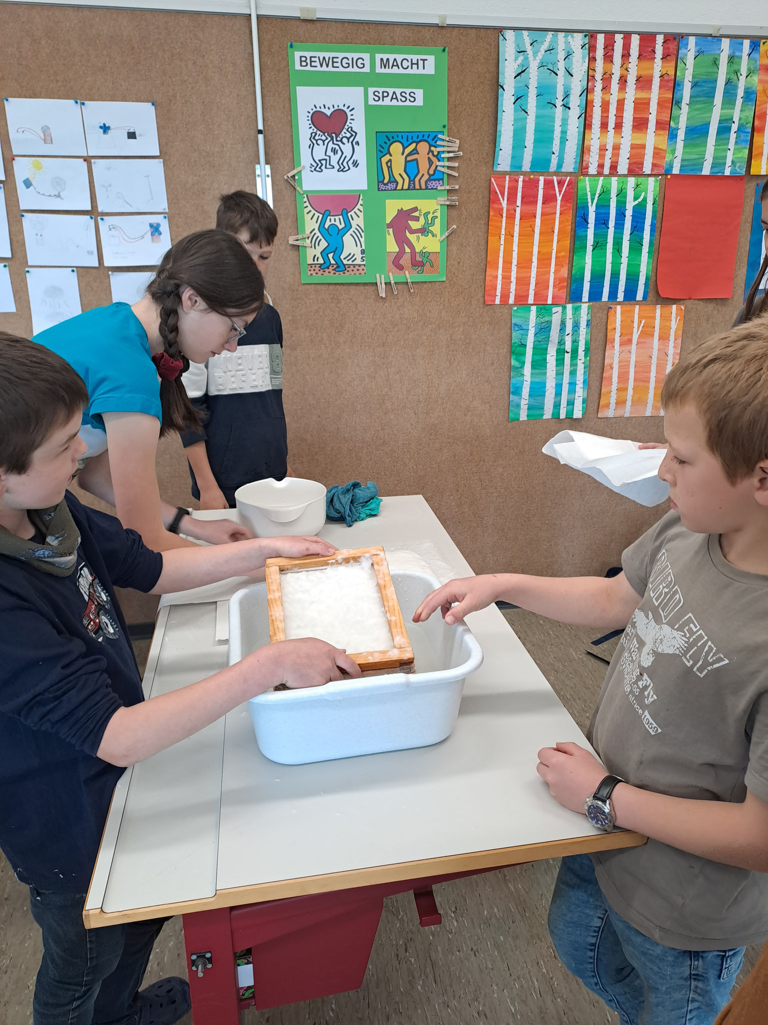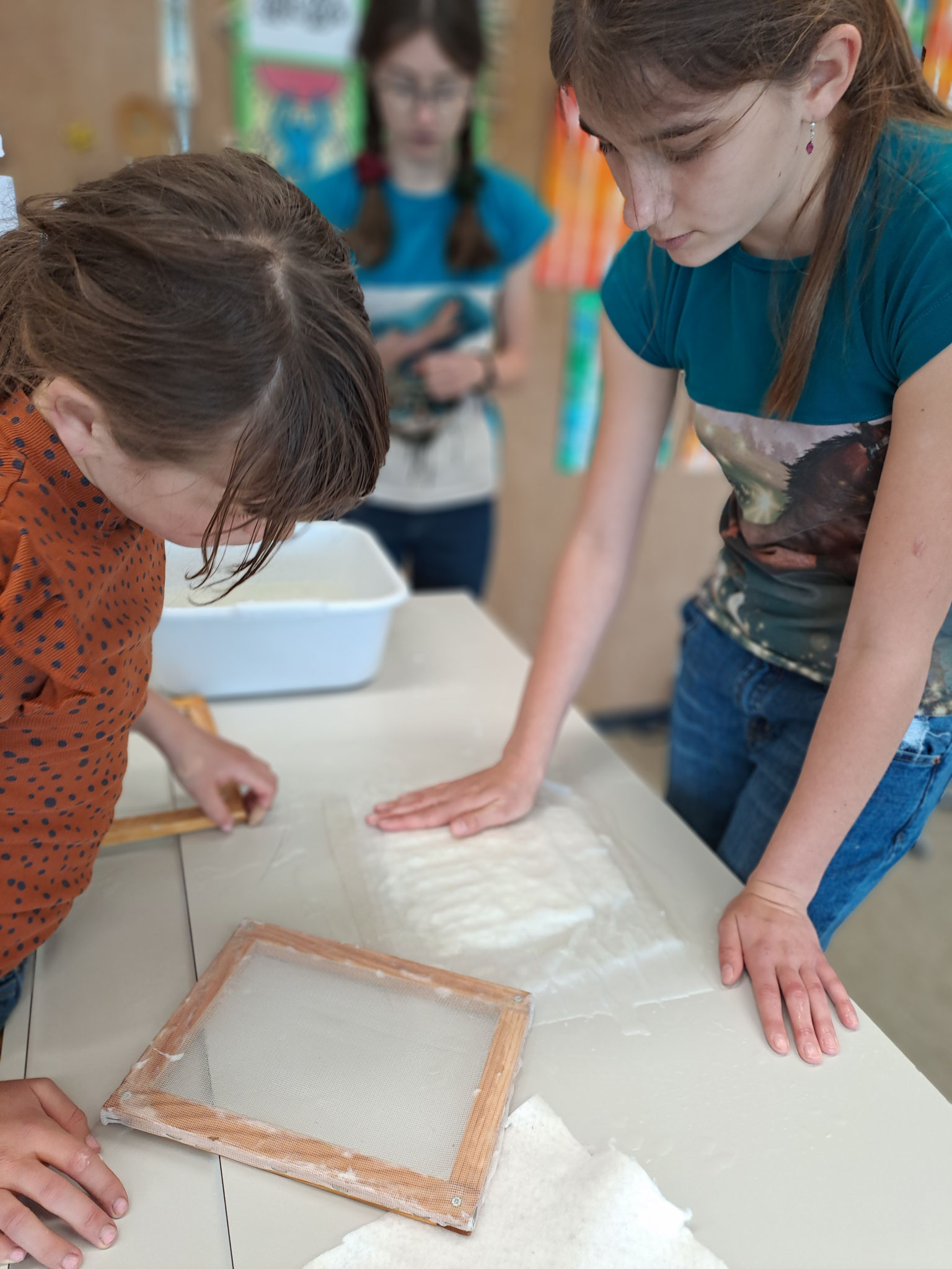 Die 3. - 6. Klasse Menzberg stellt mit selbst hergestellten Papierschnitzeln eine Pulpe her. Die Pulpe muss sehr fein gemixt werden. Die Schülerinnen und Schüler tauchen die Schöpfsiebe in die Pulpe und verteilen die Masse auf dem Sieb. Anschliessend lassen sie mit viel Sorgfalt und Geduld das überschüssige Wasser ablaufen. Sie legen den Schöpfrahmen langsam ab und gautschen das Papier auf die weiche Unterlage. Später pressen sie draussen die Papier und lassen sie trocknen.