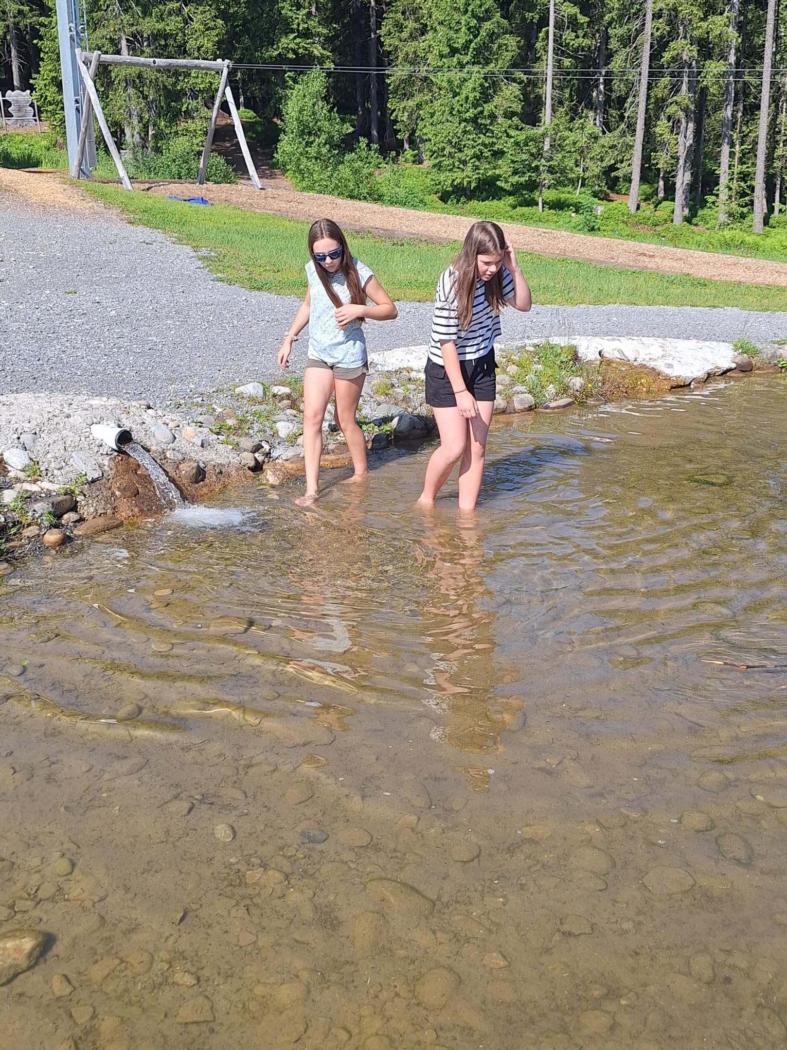 Müde sitzen wir zum Mittagessen an die Picknicktische und schlemmen aus dem Rucksack. Im kühlen Schatten stärken wir uns zur Mittagsrast, damit wir später den zweiten Teil der Wanderung schaffen. Zufrieden erreichen wir am Nachmittag unser Ziel: Kemmeribodenbad! Noch einmal amüsieren sich viele beim Klettern auf dem Spielplatz. Den Regenschauer während der Heimfahrt im Bus nehmen wir locker, zumal bei unsere Heimkehr auf dem Menzberg wieder die Sonne scheint.