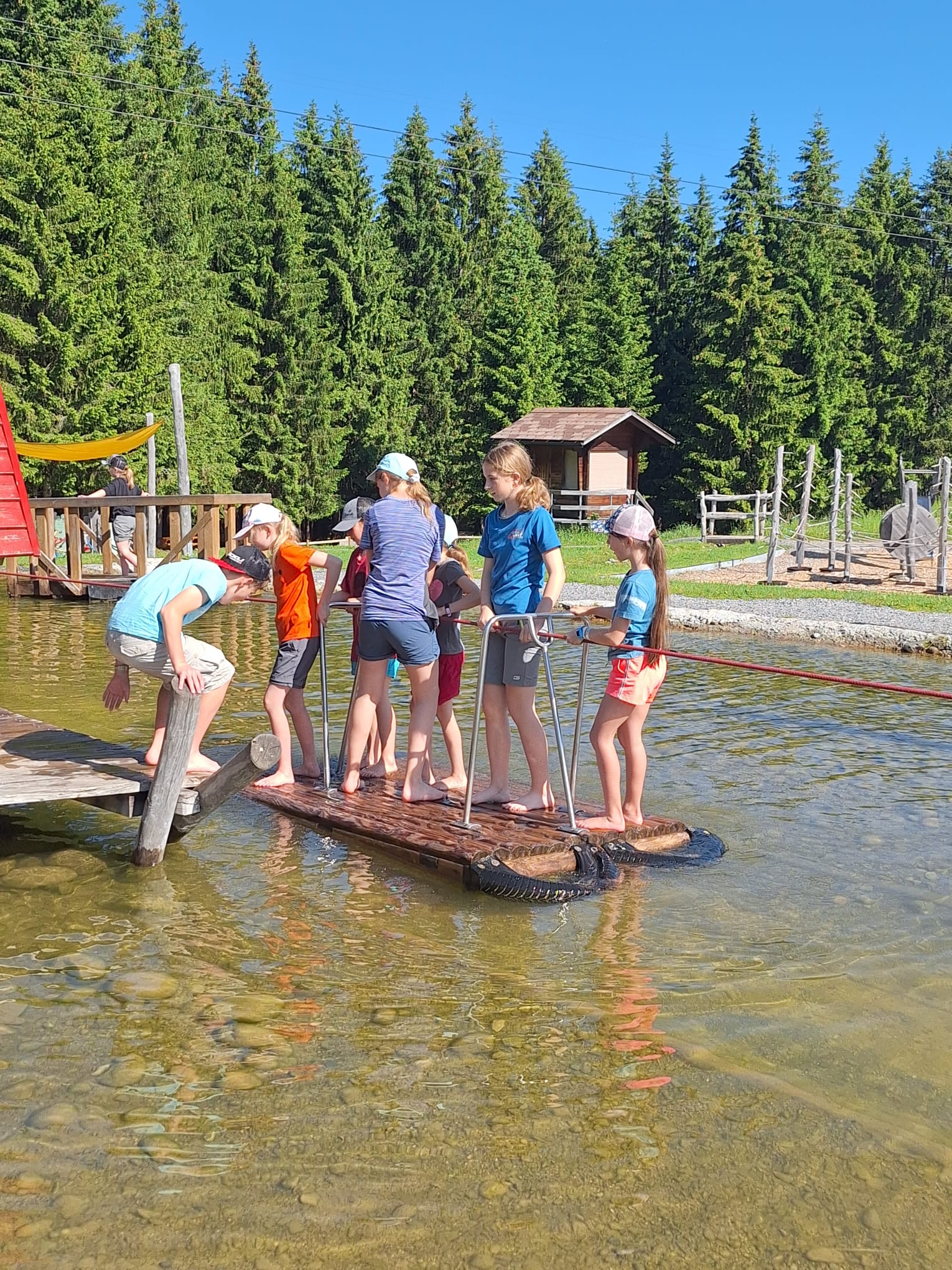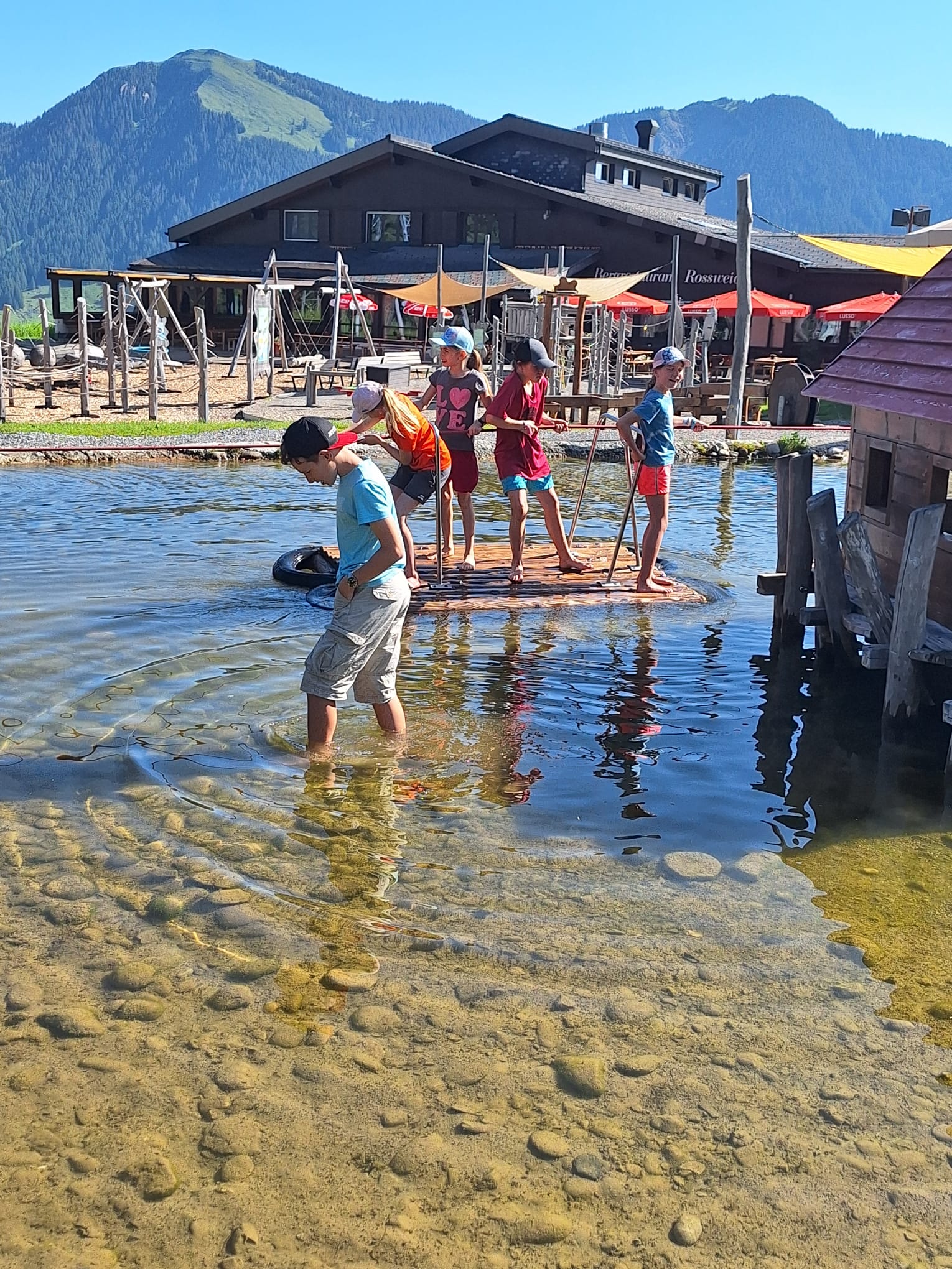 Oben spielen die Schülerinnen und Schüler mit Begeisterung im Mooraculum mit Wasser: Mehrere üben sich als Kapitäne des Flosses mit Besatzung. Barfuss vergnügen sich alle im Wasser an diesem warmen Tag mit stahlblauem Himmel: An der Wasserquelle schöpfen, Kessel abfüllen, Pumpen, Pumpen, Pumpen, Wasser kanalisieren, Wasserräder antreiben. Die Kinder balanciere, wippen, baumeln, hängen, schaukeln an allen möglichen Spielgeräten.