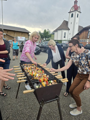 Der gemütliche Teil folgte auf dem Pausenplatz, auch wenn es dazwischen mal regnete. Für Getränke und gutes Essen war gesorgt. Viele Gespräche konnten geführt werden, bis dann der Abend mit viel Gesang und Lachen zu Ende ging.