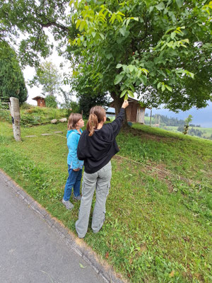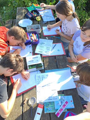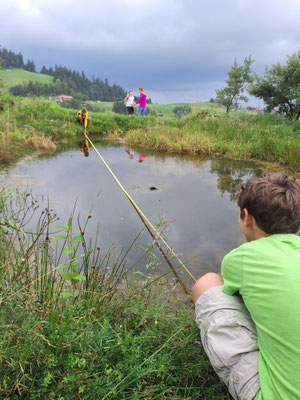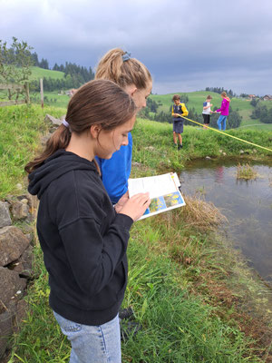 Zudem erforschen die Jugendlichen die Lage, Umgebung, Lichtverhältnisse, Wassertemperatur im und um den Weiher bei der Familie Bussmann, Unterzibershus.