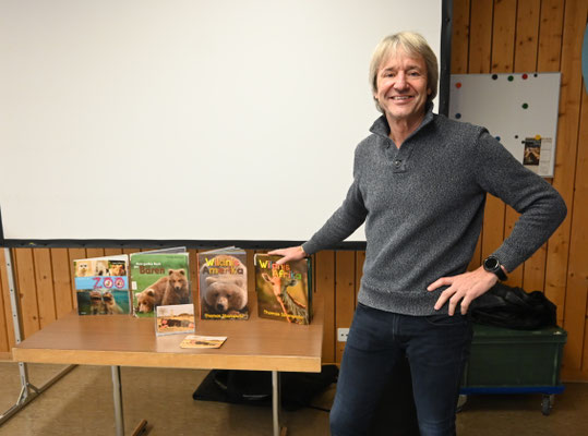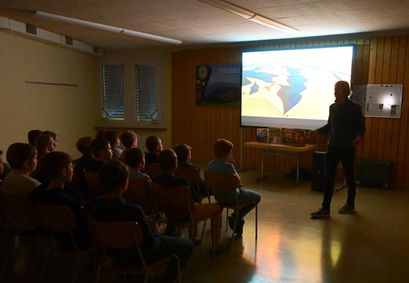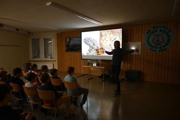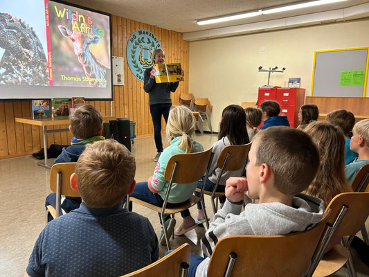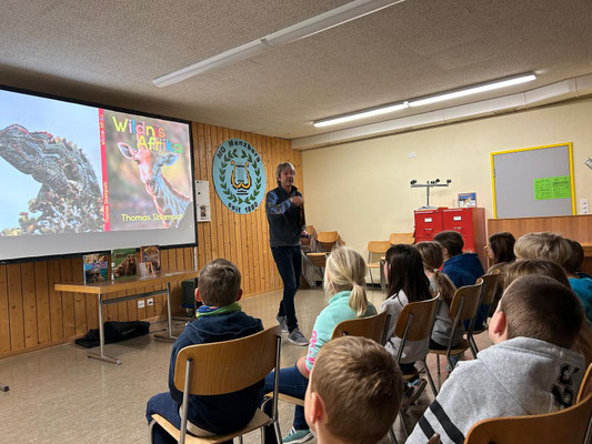 Die diesjährige Autorenlesung passte zum Schuljahresmotto „der Natur auf heisser Spur“. Thomas Sbampato ist seit Jahren mit seiner Kamera in verschiedenen Gebieten der Welt unterwegs. Seine Bilder und das gesammelte Wissen verarbeitet er unter anderem zu Sachbüchern für Kinder. Für einmal stand bei der Autorenlesung jedoch nicht das Buch im Mittelpunkt, sondern die Frage, wie der Autor zu den Bildern und Geschichten im Buch kommt. Mit welchen Reisemitteln war er unterwegs? Welche Gefahren hat er erlebt und welche Helfer haben ihn unterstützt? Gespickt von vielen lustigen und spannenden Anekdoten vermittelte Thomas Sbampato den Kindern auch gleich einiges an Wissen über fremde Gegenenden und „unsere Mitbewohner auf diesem Planeten“, wie er die Tiere nennt.