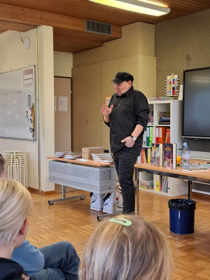 Carlo Meier kam zu uns. Er las aus einem spannenden Buch vor, und wir durften ihm Fragen