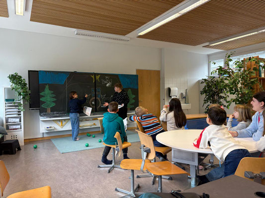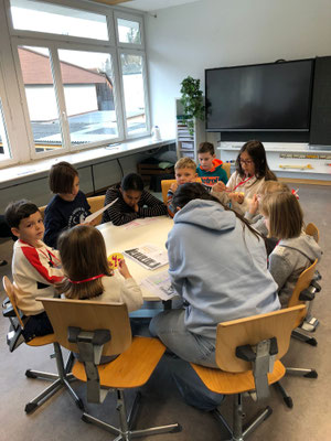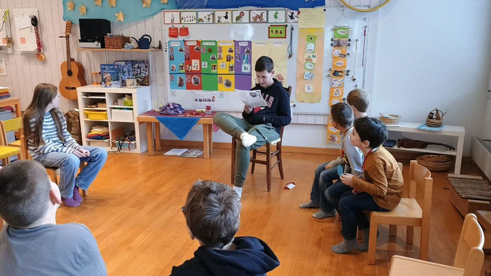 Die Schulfamilien trafen sich am Mittwoch zu ihrem zweiten Anlass. Die einzelnen Familien fanden sich draussen auf dem blauen Platz bei ihrem Familientier. Freudig ging es dann in ein Schulzimmer, in welchem die 5./6.Klässler den anderen Kindern eine spannende Weihnachtsgeschichte vorlasen. Die Jüngeren waren aufmerksame Zuhörer. Anschliessend ging es darum, die Geschichte in Rollen aufzuteilen. Auch da übernahmen die Grossen die Führung und verteilten die einzelnen Aufgaben. Es entstanden individuelle Rollenspiele, Theaterstücke und Klanggeschichten.
