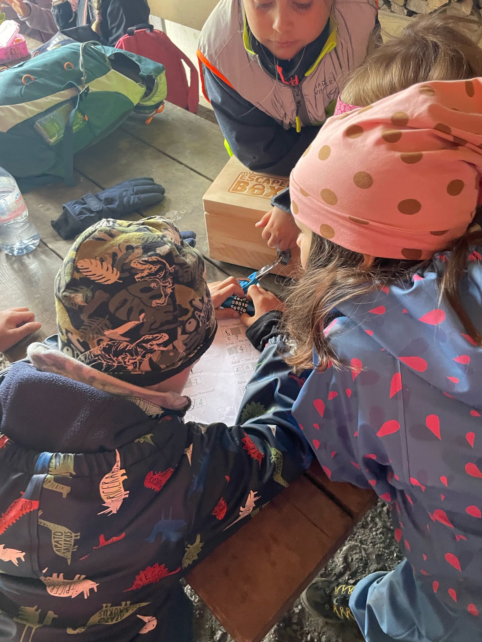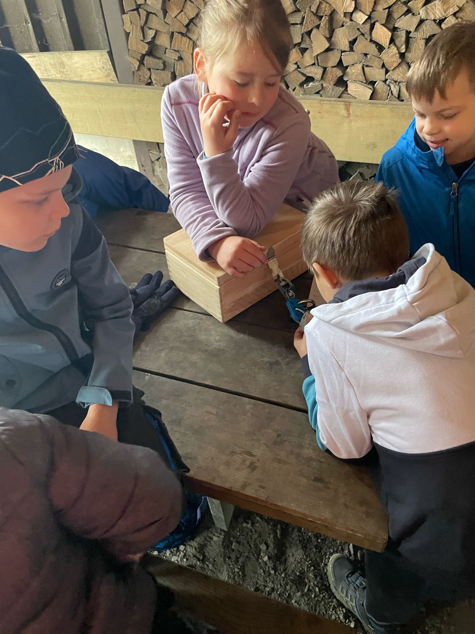 Doch mithilfe der Lehrerin wurde auch dieser Code geknackt. In der Schatztruhe versteckte sich eine süsse Überraschung. Nun wurde das leckere Znüni vom Grill gegessen, bevor dann ausgiebig gespielt wurde. Im Freispiel wurden viele Äste geschnitzt und gesägt, viel herum gerannt, sowie "Stockkämpfe" ausgeübt. Am Mittag waren dann alle Kinder etwas ausgepowert, was hoffentlich dazu führte, dass das Konzentrieren im Schulzimmer am Nachmittag etwas leichter fiel.