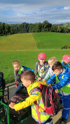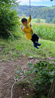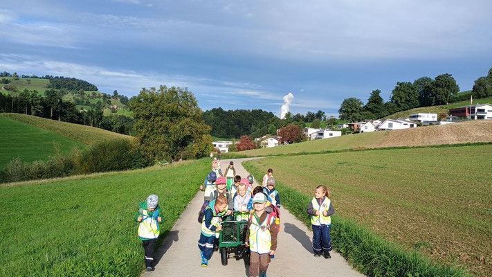 Wir sind bei prächtigem Sonnenschein gestartet. Die Kinder waren fröhlich und haben die vielen Eindrücke genossen. Auf dem Weg haben wir Hühner, Hunde, Kühe und Vögel beobachtet. Die Kinder haben viel gelacht und miteinander geplaudert. Im Wald angekommen erwarteten uns Sägespäne. Das hat an das eidgenössische Schwing und Älplerfest erinnert. Das konnten die Kinder dann im Wald auch ausgiebig nachspielen. Am Boden gab es einen Ring und die Kräfte wurden gemessen. Es ist erstaunlich wie friedlich die Kinder miteinander umgehen, auch wenn es ums Kämpfen geht.