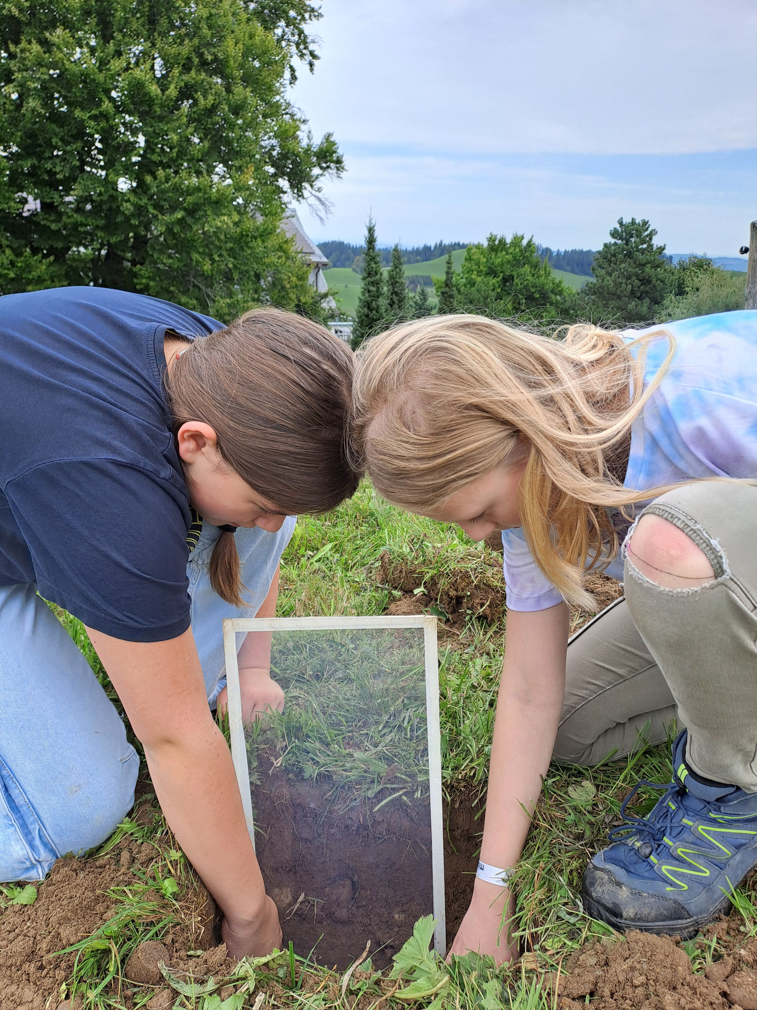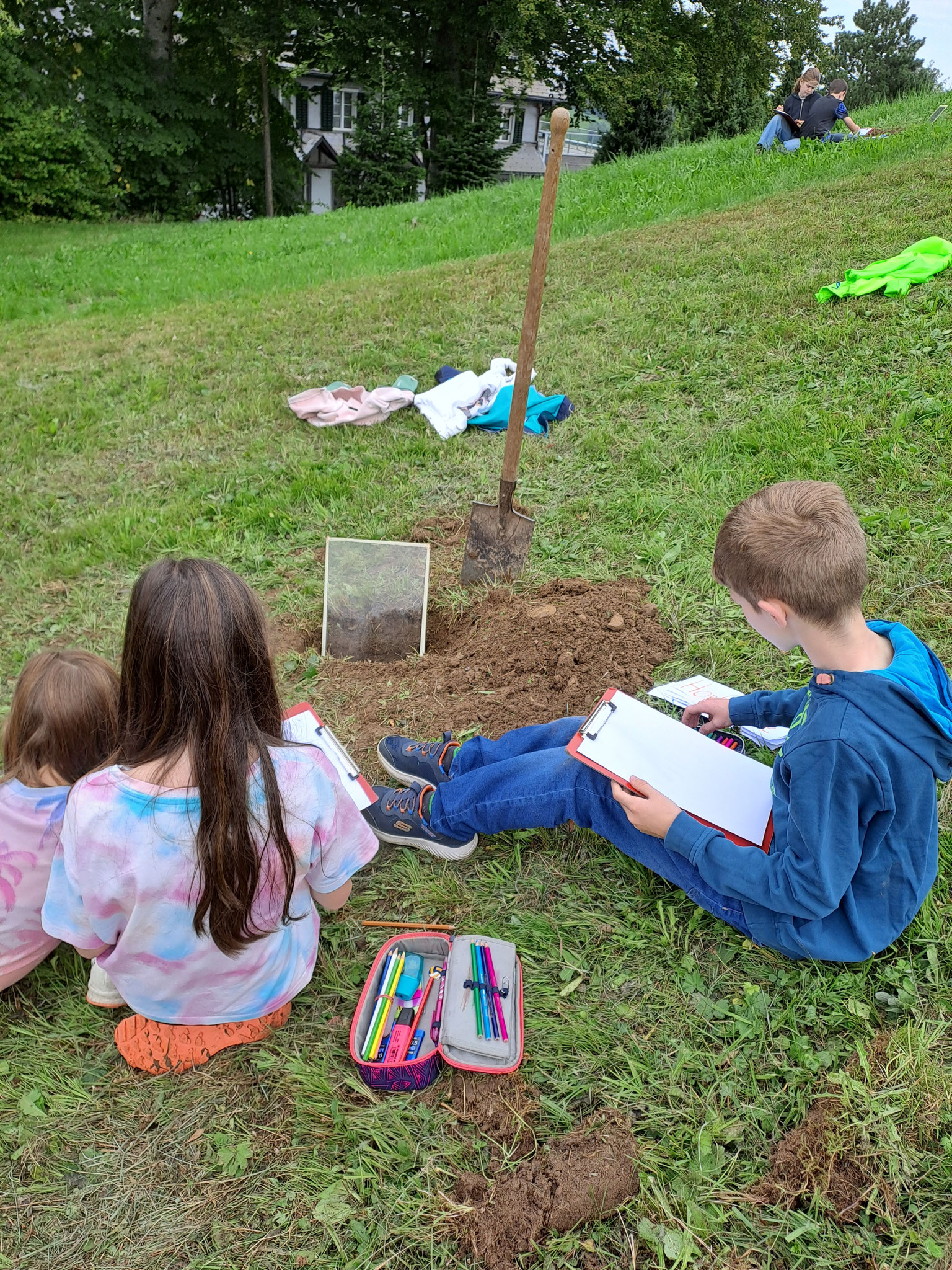 Bei einem tiefgründigen Spatenstich zeigt sich die Welt unter dem Boden: Der Aufschnitt gibt Aufschluss über die unsichtbaren Bodenschichten, das Wurzelwerk, die Bodentiere und deren Gänge. Die Klasse freut sich, dass sie mit schwerem Handwerk umgehen darf und neue Erkenntnisse unter Boden möglich werden. Das Werkzeugt muss anschliessend auch gewaschen werden. Am Dorfbrunnen macht das Spass!
