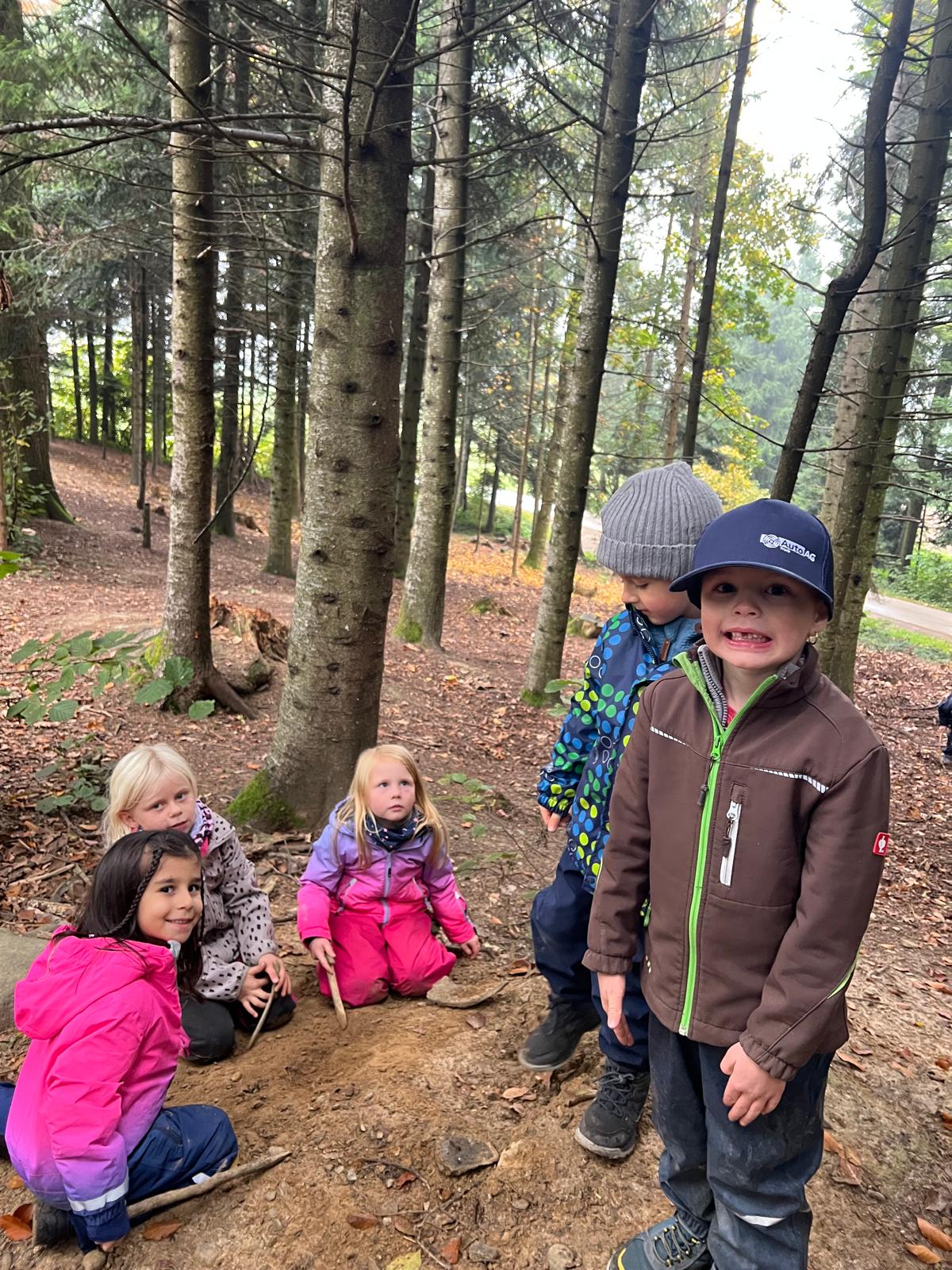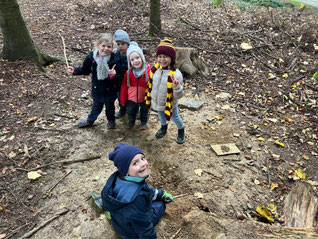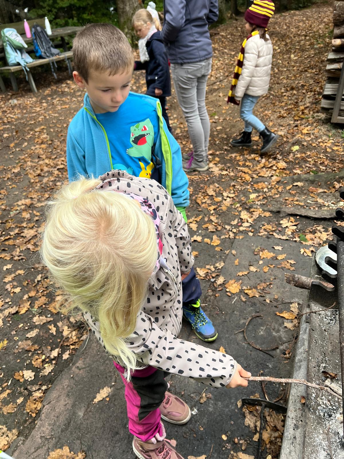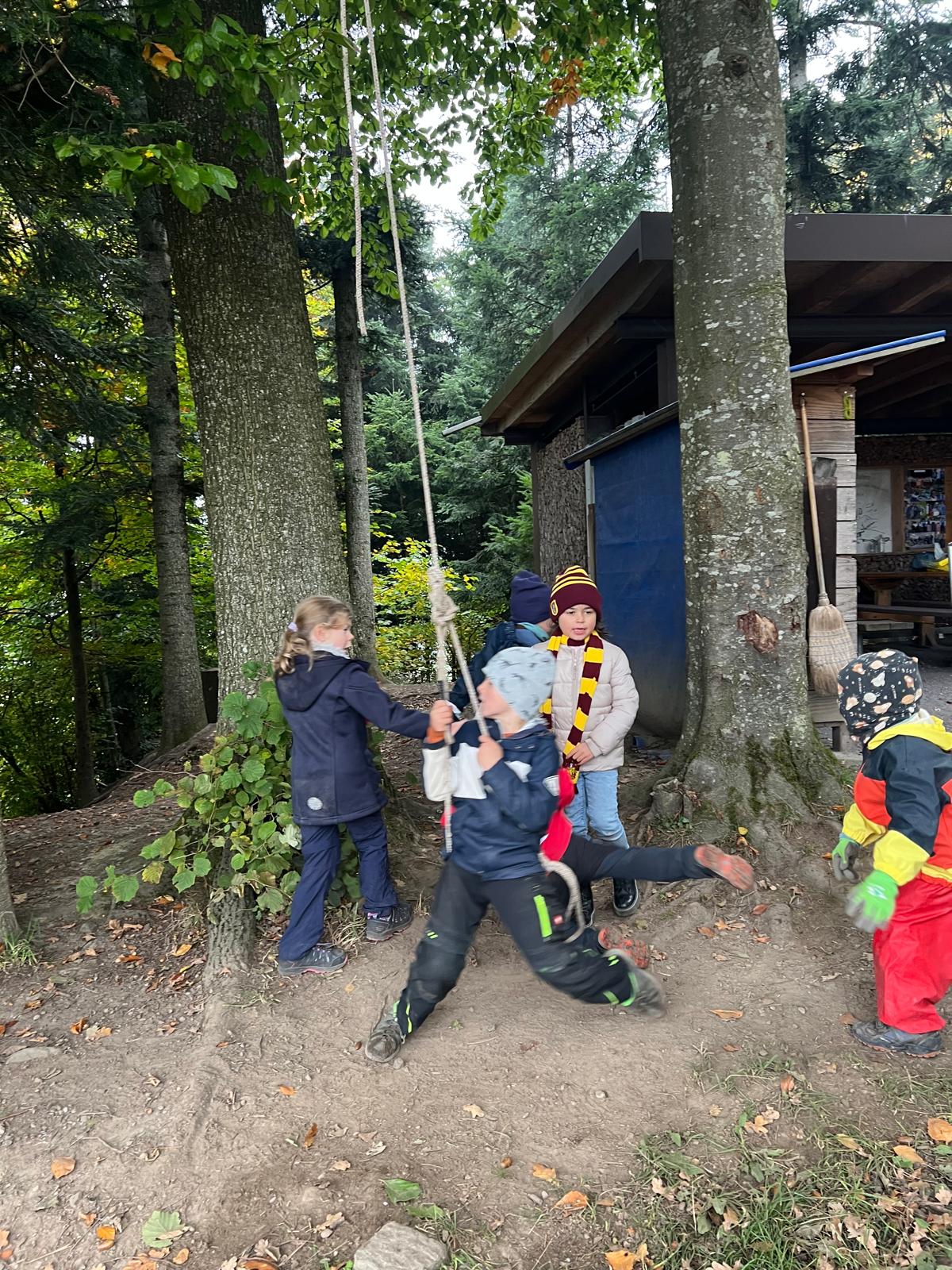 Am Freitagmorgen, 17. Oktober, gingen wir mit dem Kindergarten 2 in den Wald. Zu Beginn konnte gleich eine Gruppe von Kindern das Feuer für das gemeinsame Znüni machen. Sie lernten dabei, wie man Feuer macht und auf was man aufpassen muss beim Umgang mit Feuer. Die anderen Kinder haben verschiedene Waldgegenstände gesucht und dann geordnet. Gemeinsam haben wir die gesammelten Blätter, Rinde, Eicheln, Tannenzapfen und Stecken gezählt und den Ziffern zugeordnet. Danach wurde eine neue Waldhütte gebaut. Zum Znüni gab es zum Aufwärmen Punch und einen Cervelat oder Wurst vom Feuer. Kurz vor 11 Uhr räumten wir auf und gingen gemeinsam wieder ins Dorf.