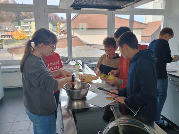 Wir haben uns dazu auf ein Datum geeinigt und haben in der Freizeit zu Hause oder in der Kochschule gebacken/gekocht. Dabei haben wir gemerkt, wie wichtig der Zusammenhalt ist und dass es auch ziemlich anspruchsvoll war, ein Gericht einfach ganz allein zu backen oder zu kochen. Gemacht haben wir zum Beispiel Apfelkuchen aus Thurgau, Kügelipastetli von Luzern, Rüeblitorte aus Aargau, Zürigeschnetzeltes von Zürich und Rissoles aux poires aus Genf.