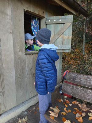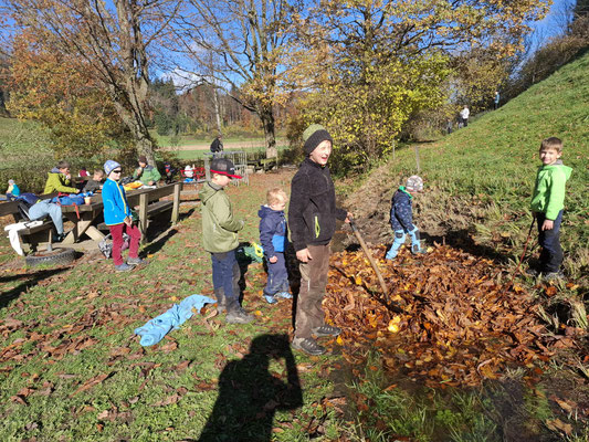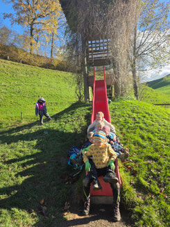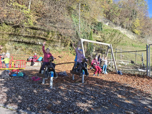 Mittags trafen sich alle Gruppen auf dem grossen Spielplatz mit Grillstelle, wo gemeinsam gegessen, gespielt und gelacht wurde. Einige Kinder hatten allerdings auf dem Nachhauseweg ganz schön schwere Rucksäcke, denn sie konnten der Versuchung nicht widerstehen, ihre Taschen mit glänzenden Kastanien zu füllen.