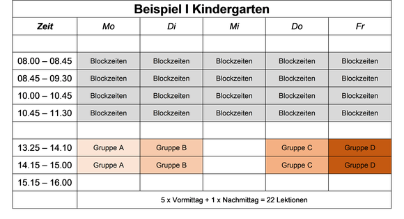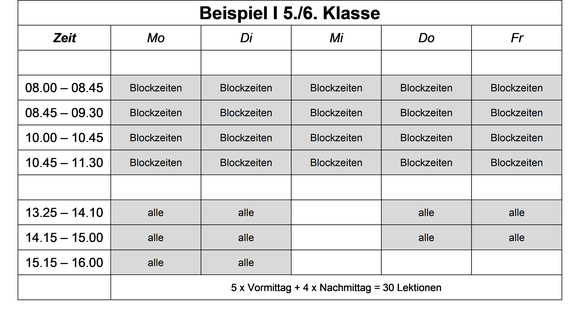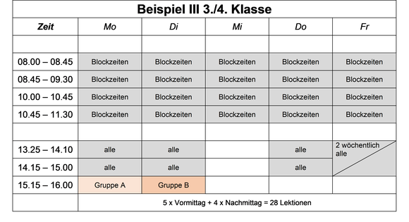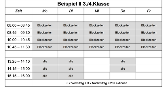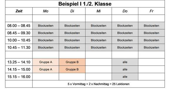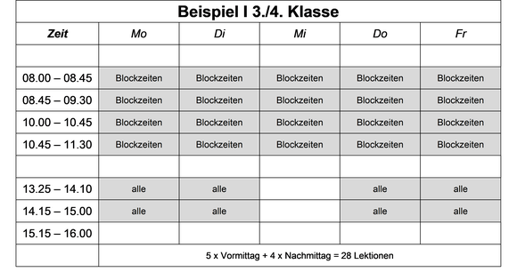 Die Schülerinnen und Schüler verweilen an fünf Vormittagen pro Woche mindestens vier Lektionen in der Schule. Der Unterricht wird bewusst rhythmisiert und strukturiert. Massgebend ist die gesamte Unterrichtszeit, wie sie in den Wochenstundentafeln festgelegt ist. Die Verteilung auf die verschiedenen Fächer wird anteilsmässig vorgenommen.